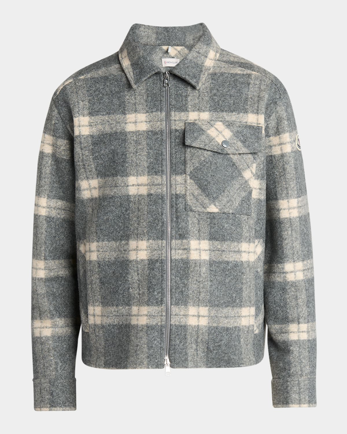 - Moncler shirt jacket in a classic tartan check accented with a large chest pocket - Signature logo emblem on the left sleeve - Shirt collar - Two-way zip front - Side welt pockets - Long sleeves - Snap cuffs - Curved hem - Polyester/wool/acrylic - Professional cleaning recommended - Made in Romania