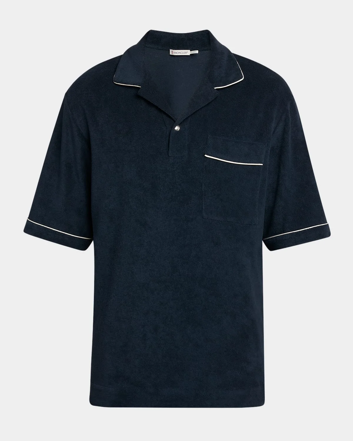 Moncler polo shirt in soft, absorbent terry Notched collar Singlebutton placket Chest patch pocket Short sleeves Relaxed fit Pullover style Cotton Made in Albania