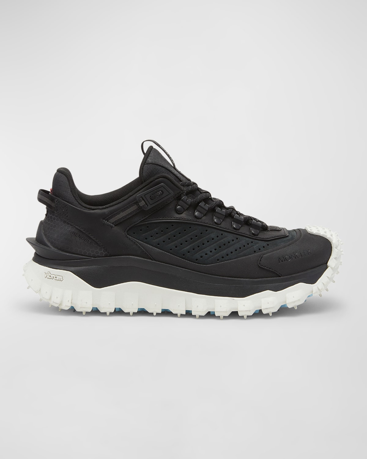 - Moncler "Trailgrip GTX" low-top sneakers in leather and nylon - Flat heel - Reinforced round toe - Lace-up vamp - Pull tab at tongue and backstay - Padded collar - Branded heel counter - Rubber outsole - Vibram® Megagrip tread adds traction and slip resistance - Lining: Nylon - Imported
