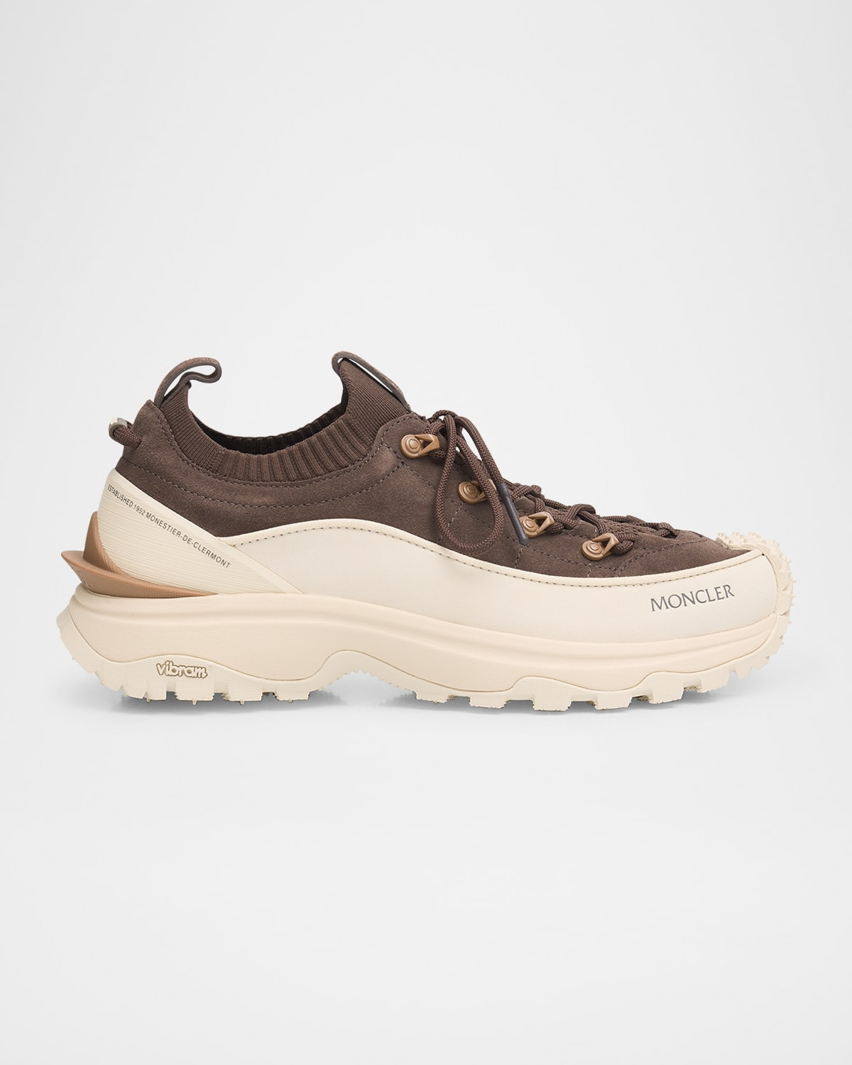 - Trails and hikes, meet the Moncler "Trailgrip Lite 3" sneaker. Combined with a low-top knit sock, the nubuck and suede shoe is flexible and fit for warm-weather outdoor activities. - Vibram® MEGAGRIP Compound for traction and durability - Flat heel - Reinforced round toe - Lace-up vamp - Pull tab on the backstay - Polyester lining - OrthoLite® washable insole for added breathability - Branded TPU spoiler - EVA midsole - Rubber outsole - Professional cleaning recommended - Imported