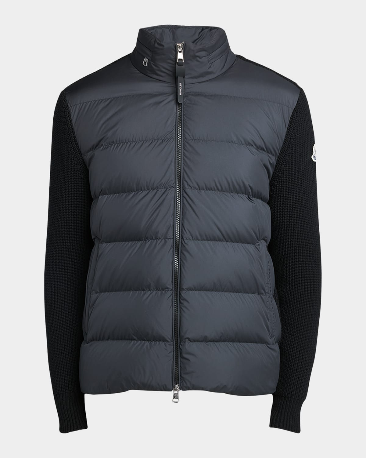 - Moncler knit jacket featuring a padded front and zip-hideable hood - Stand collar; two-way zip front - Long sleeves - Ribbed cuffs - Side welt pockets - Leather logo patch - Zipped pockets with embossed leather trim - Gauge 12 - Regular fit - Polyester/virgin wool/cashmere - Lining: micro chich nylon - Fill: Down/feather - Partial lining - Dry clean - Imported - Model is 6'1"/185cm.