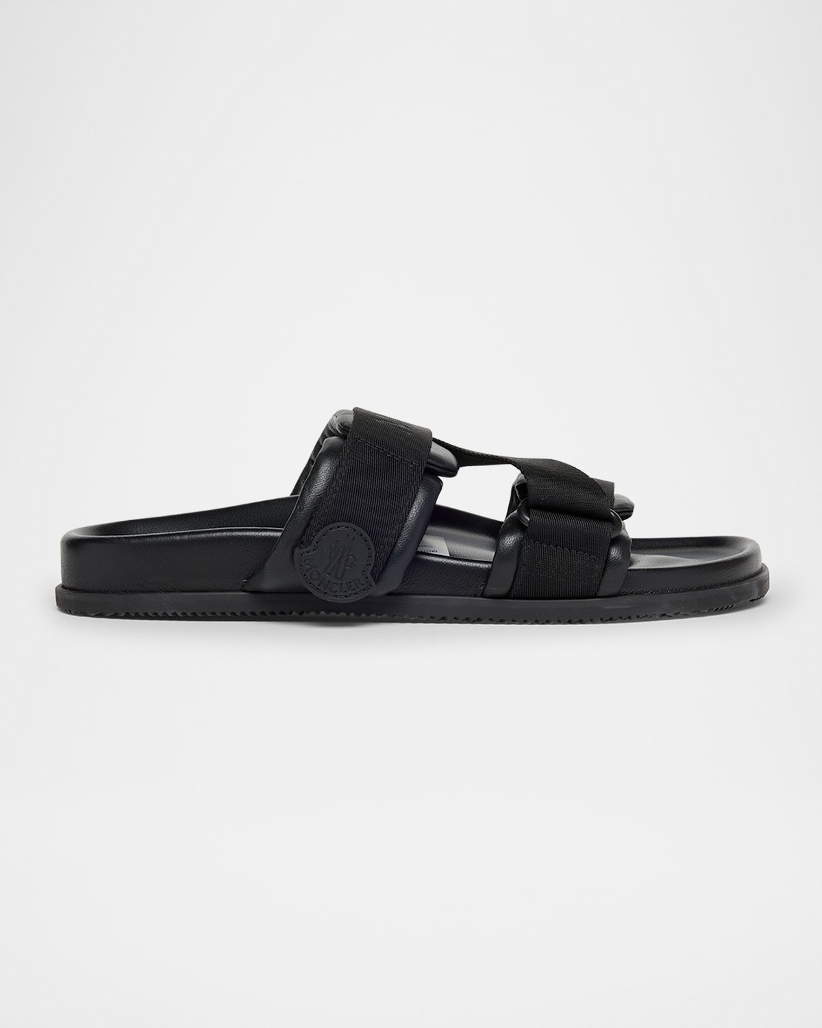 - Moncler "Mon Summer" leather sandals with crisscross logo-stamped polyester strap - Flat heel - Dual band upper - Slip-on style - Molded footbed - Rubber outsole - Lining: Leather - Made in Italy