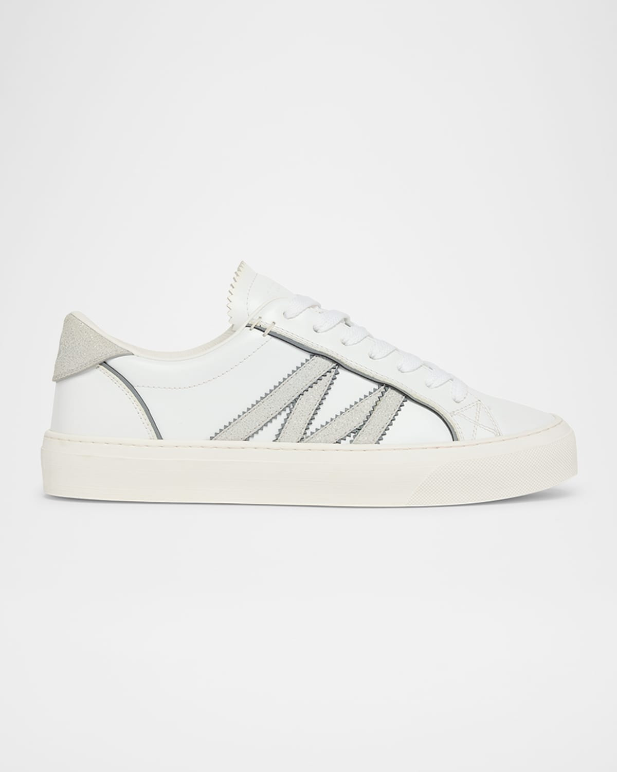 - Moncler "Monaco 2" low-top sneakers in calf leather with a glittered side monogram patch and heel tab - Flat heel - Round toe - Lace-up vamp - Leather lining - Rubber outsole - Made in Italy