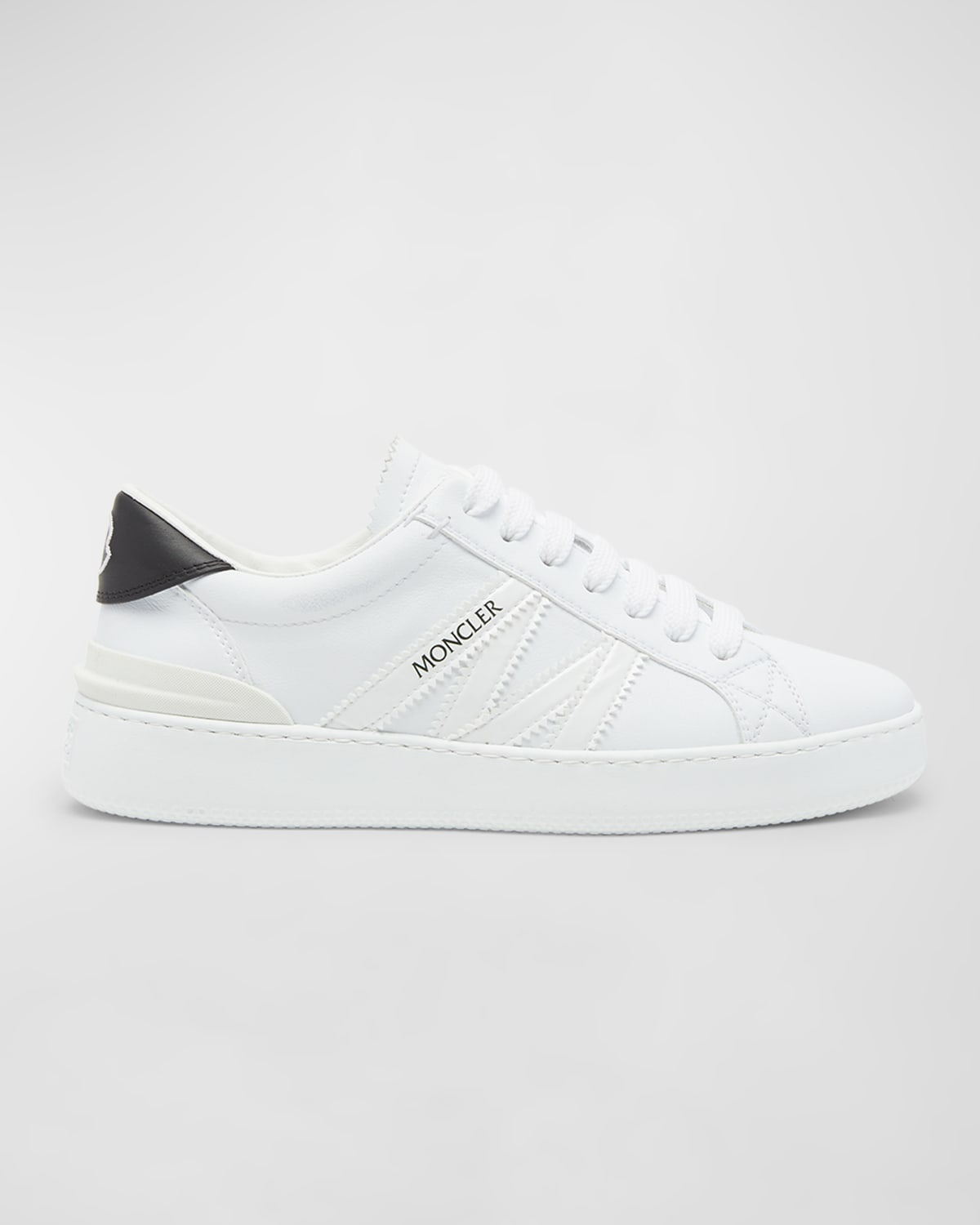 - Moncler low-top sneakers in calf leather - Flat heel - Round toe - Lace-up vamp - Debossed tongue logo - Logo emblem at backstay - Tonal M-logo overlays on the sides - Rubber outsole - Lining: Nylon - Made in Italy