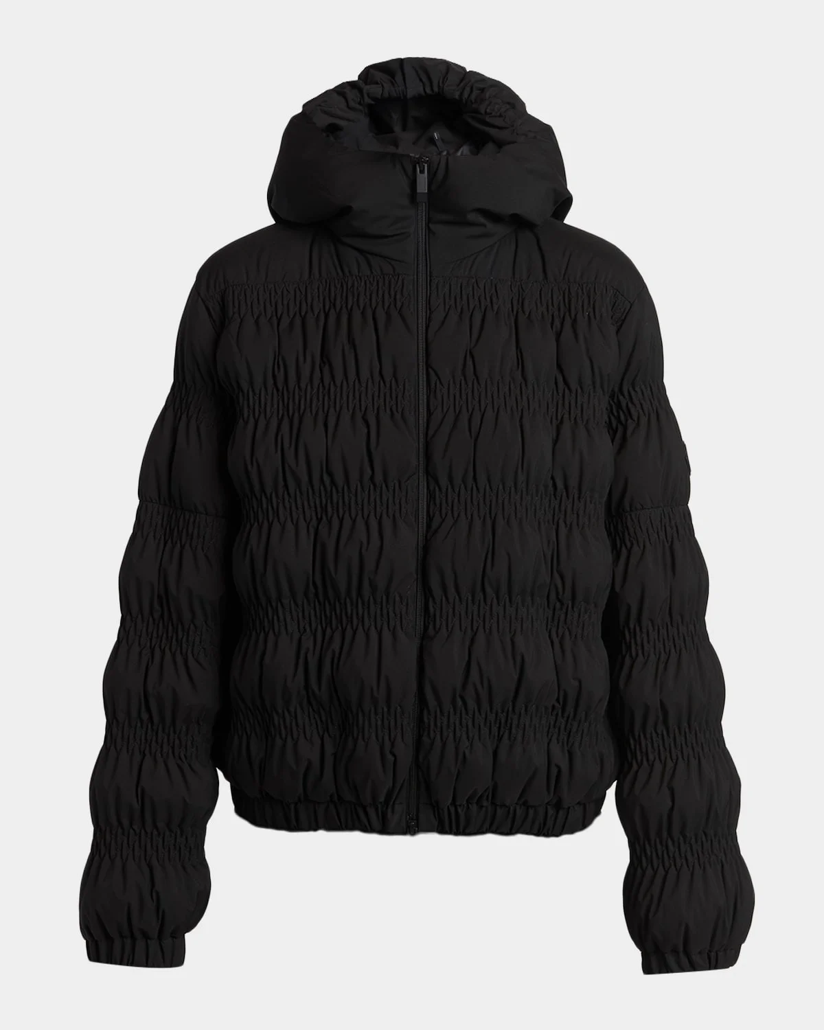 Crafted from taffeta, the "Noyer" jacket & nbsp;by Moncler features an all-over gathered technique and premium down insulation for a dimensional silhouette with endless warmth. Signature logo patch on the left sleeve Hooded neckline & nbsp; Long sleeves with elastic cuffs Invisible side pockets Classic fit Hem sits at the hip & nbsp; Two-way zip-front & nbsp; Polyester/nylon/polyamide Fill: Down/feather Lining: Polyurethane Machine wash cold Imported This product contains perfluoroalkyl and polyfluoroalkyl substances (PFAS). For more information, please visit the manufacturer's website.