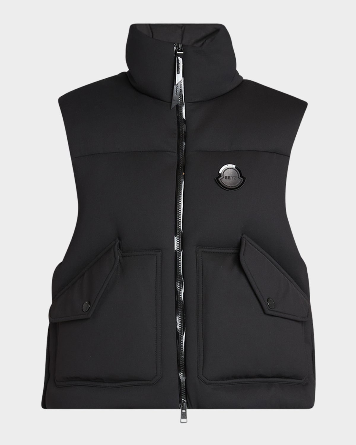 - The "Otis" down-filled puffer vest by Moncler Genius is the perfect transitional piece for cool to cold weather, keeping you warm while offering a sleek and stylish silhouette. - Features signature tonal log patch on the left chest - Stand collar; two-way zip-front - Sleeveless - Angled flap pockets with snap closure - Boxy fit - Hem sits at the hip - Nylon/polyamide/cotton/elastane - Fill: Feather/down - Lining: Nylon - Dry clean - Imported