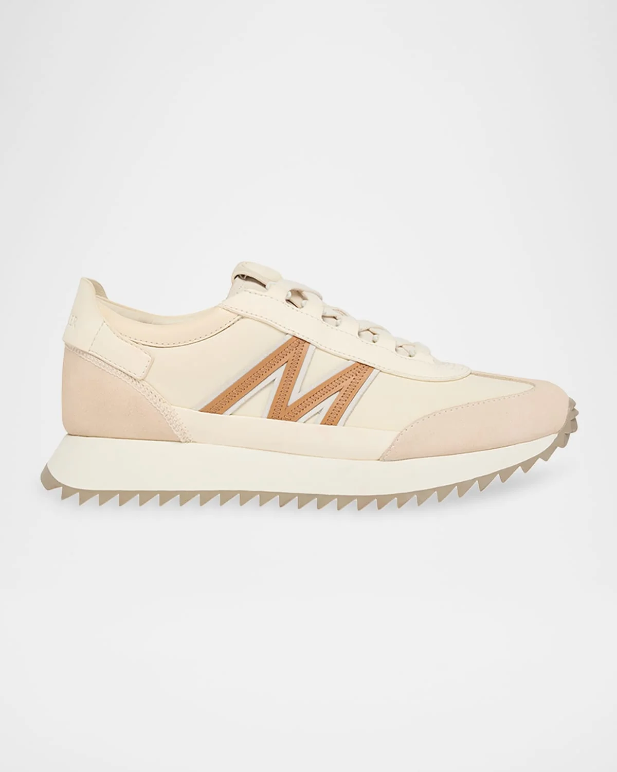 Moncler "Pacey2" lowtop sneakers crafted from nylon, suede, and nubuck with a bold monogram accent 1.25 in / 30 mm flat heel Round toe Laceup vamp Padded collar Rubber outsole Nylon mesh lining Made in Italy