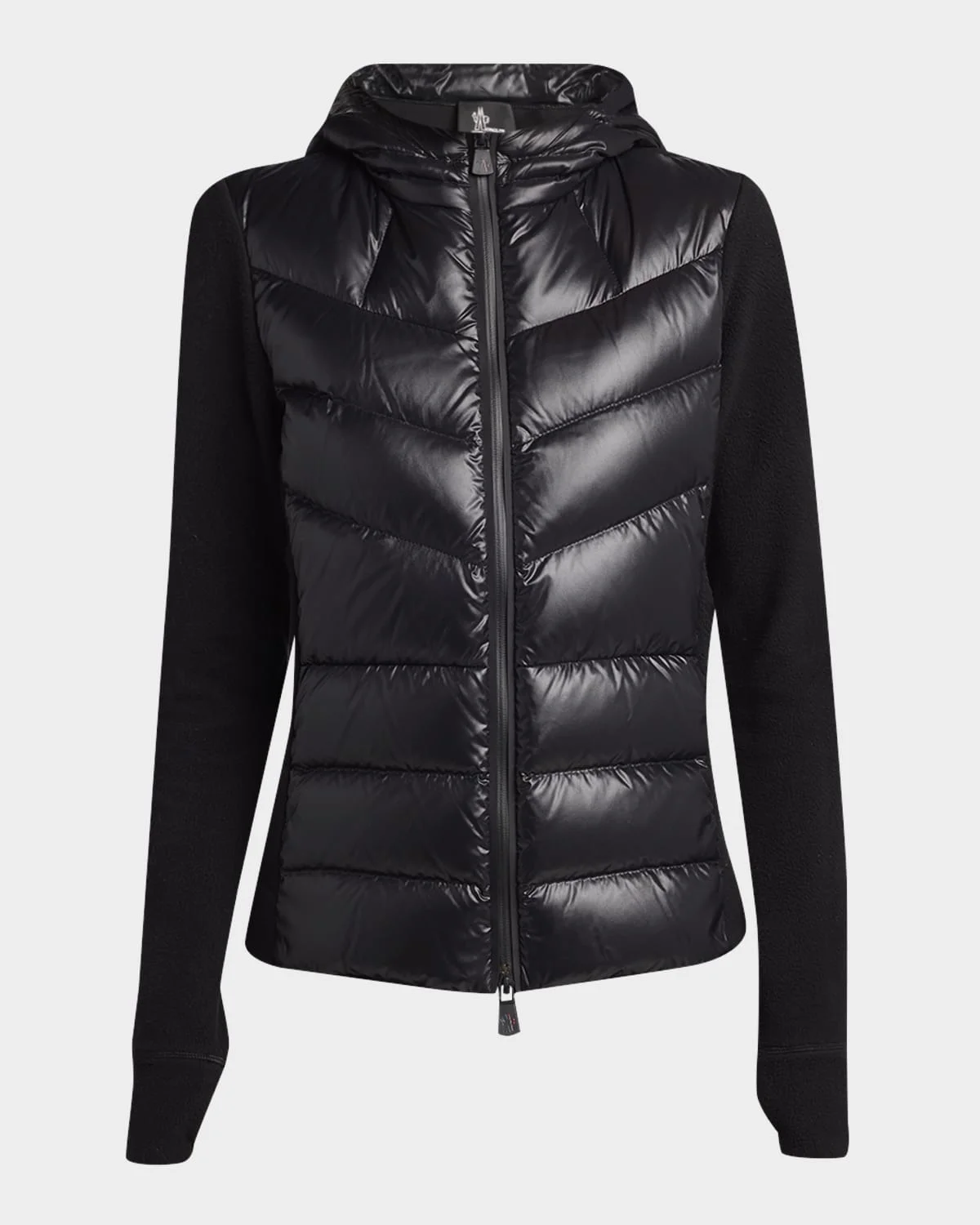 Crafted in stretch fleece with a padded nylon body, this cardigan from the Moncler Grenoble Collection is designed as a midlayer under a heavier jacket for extensive warmth. Adjustable drawcord hood Long sleeves Signature embroidered logo patch on the left sleeve Classic fit Hem sits at the hip YKK® AquaGuard® Highly Water Resistant twoway zipfront Polyester/elastane/nylon/polyamide Fill: Down/feather Lining: Polyester Machine wash cold Imported