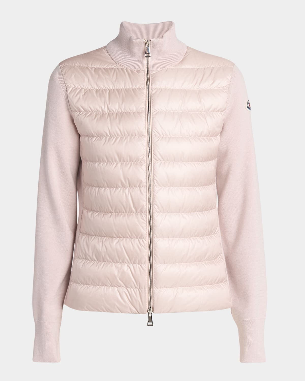 - Crafted from wool, this cardigan is enhanced with a down-filled nylon leger front. The lightweight knit comes in a high-neck, zip-up silhouette. - Moncler combo cardigan featuring a padded bodice finished with knit collar and sleeves - Stand collar - Long sleeves - Embroidered logo patch at left sleeve - Classic fit - Hem sits at the hip - Two-way zip-front - Nylon/polyamide/virgin wool - Fill: Down/feather - Lining: Nylon - Professional cleaning recommended - Imported