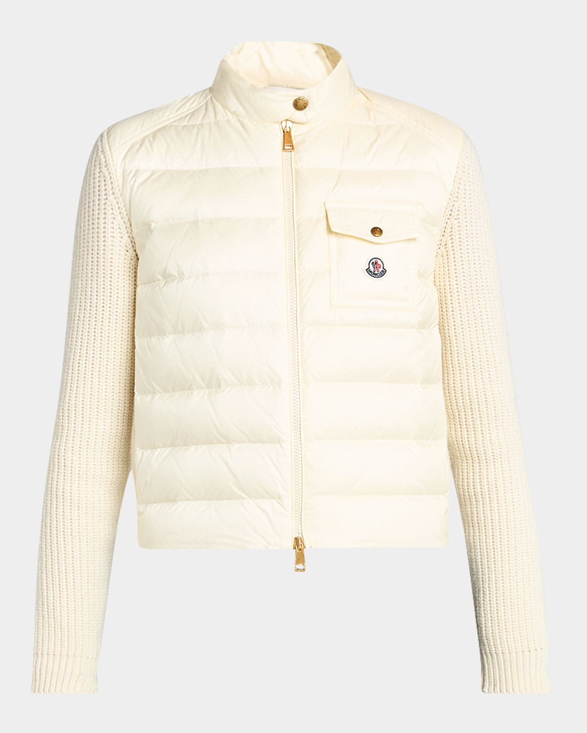- Moncler soft merino wool-blend cardigan finished with down-filled padded front for added warmth - Stand collar with snap closure - Long sleeves - Side zip pockets - Chest pocket with signature embroidered logo patch - Slim fit - Adjustable drawstring hem - Two-way zip-front - Virgin wool/cashmere/nylon/polyamide - Lining: Nylon - Fill: Down/feather - Professional cleaning recommended - Imported