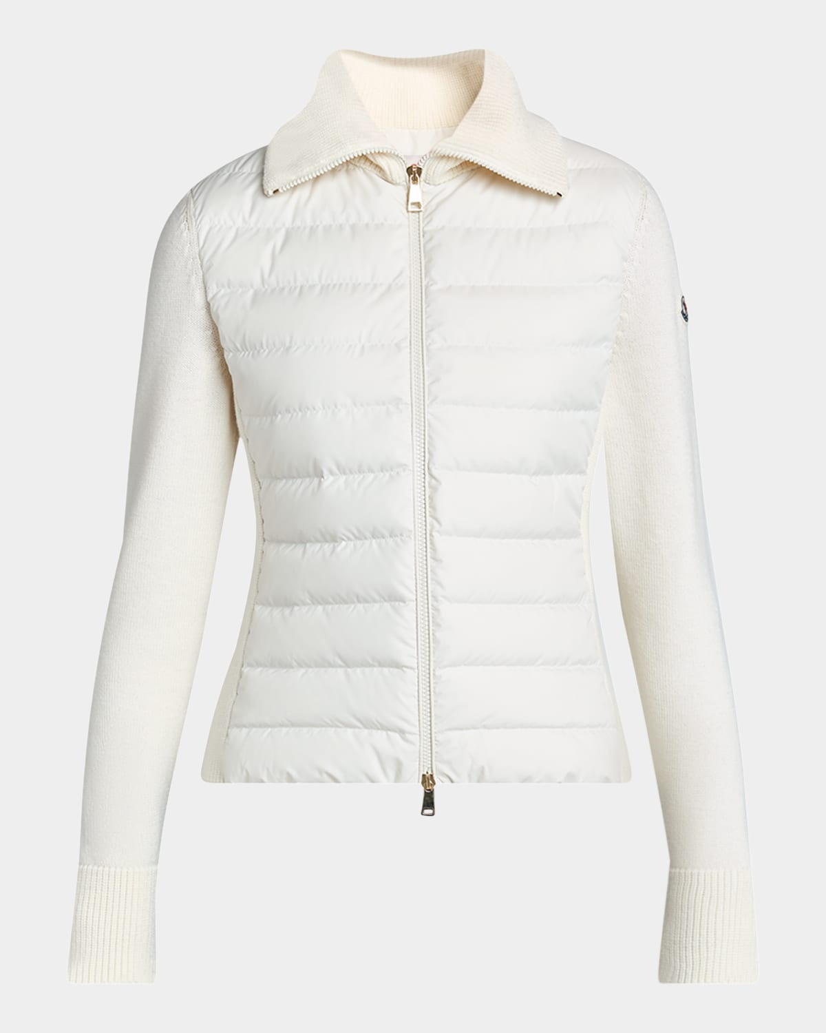 - Moncler fine wool cardigan enhanced with a down-filled front and back - Ribbed spread collar - Long sleeves with ribbed cuffs - Signature embroidered logo patch on left sleeve - Slim fit - Hem sits at the hip - Two-way zip-front - Virgin wool/polyester - Fill: Down/feather - Lining: Polyester - Professional cleaning recommended - Imported