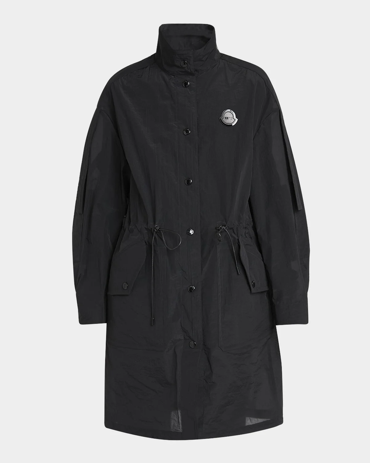- A lightweight water-repellent piece from the Moncler Genius collection, the "Prapiroon" long parka features an adjustable drawstring waist with leather ties to cinch the waist and elevate your look. - Features a signature tonal logo patch on the left chest - Stand collar - Dropped shoulders - Long sleeves with snap cuffs - Oversized, dual-entry pockets - Relaxed fit - Walking vent - Snap-front - Nylon/polyamide - Machine wash cold - Imported