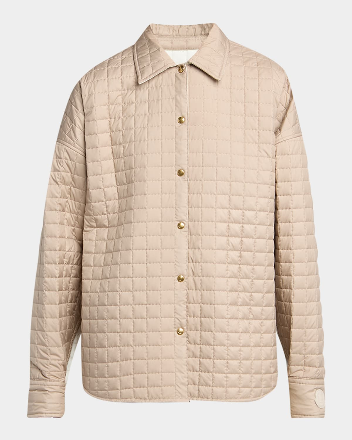 - Moncler quilted shirt jacket reverses for versatile styling - Point collar - Dropped shoulders - Long sleeves with snap cuffs - Silicone logo patch at left sleeve cuff - Relaxed fit - Rounded hem - Snap-front - Polyester/leather - Lining: Polyester - Hand wash - Made in Hungary