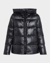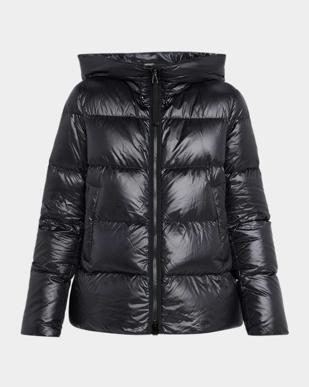 - Moncler "Serittes" quilted short puffer jacket in nylon leger - Adjustable hood - Long sleeves - Tonal logo patch at left sleeve - Side zip pockets - Classic fit - Two-way zip-front - Nylon/polyamide - Fill: Down/feather - Lining: Nylon - Hand wash - Imported