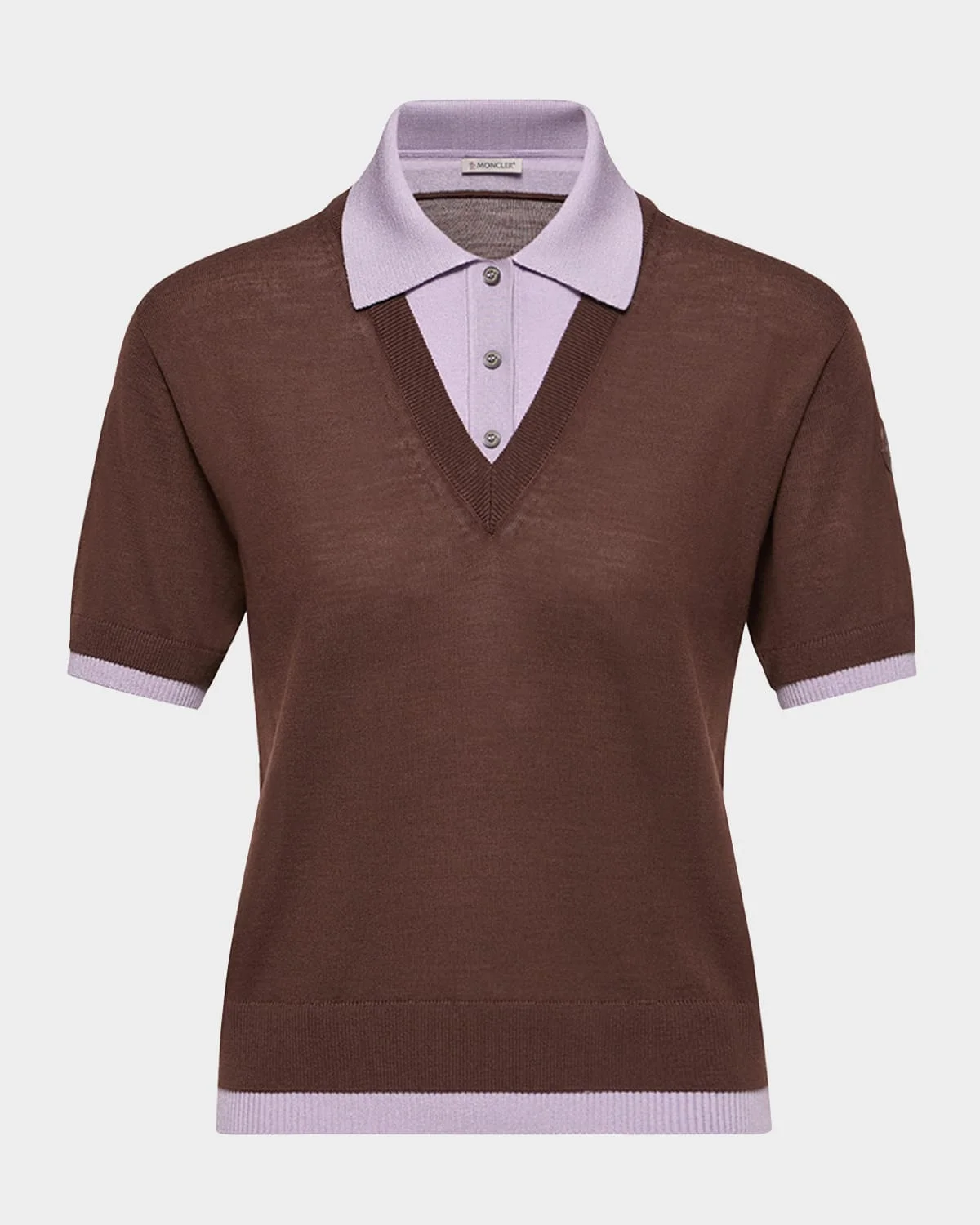 Moncler ultra-soft sweater detailed with a contrast polo underlayer & nbsp; Features a tonal leather logo patch on the left sleeve Point collar; button-placket & nbsp; Short sleeves Classic fit Hem sits at the hip Pullover style Polyester/virgin wool Lining: Polyester Dry clean Imported This product contains perfluoroalkyl and polyfluoroalkyl substances (PFAS). For more information, please visit the manufacturer's website.SIZE & FITModel measurements: 5 & apos;10" tallModel is wearing a US size 4/Small