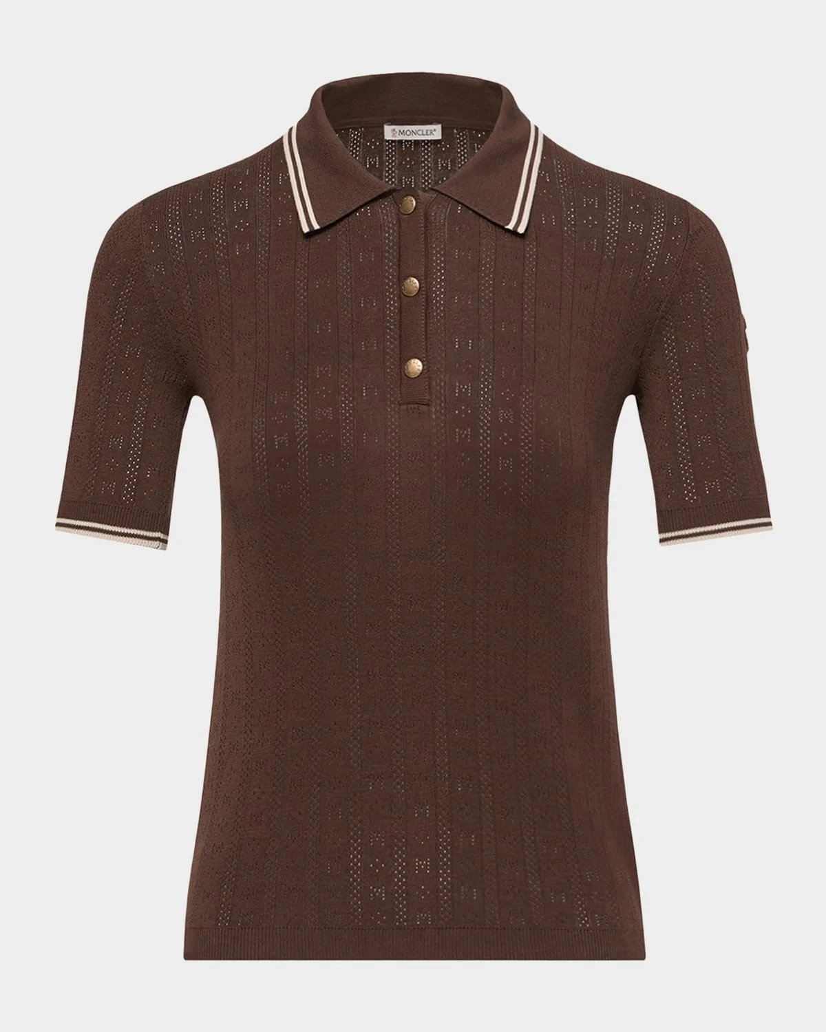 Moncler classic polo shirt crafted from delicate pointelle knit & nbsp; Features a signature logo patch on the left sleeve & nbsp; Point collar; snap-placket & nbsp; Short sleeves Classic fit Hem sits at the hip Pullover style & nbsp; Cotton Machine wash & nbsp; Imported SIZE & FIT Model measurements: 5 & apos;10" tall Model is wearing a US size 4/Small