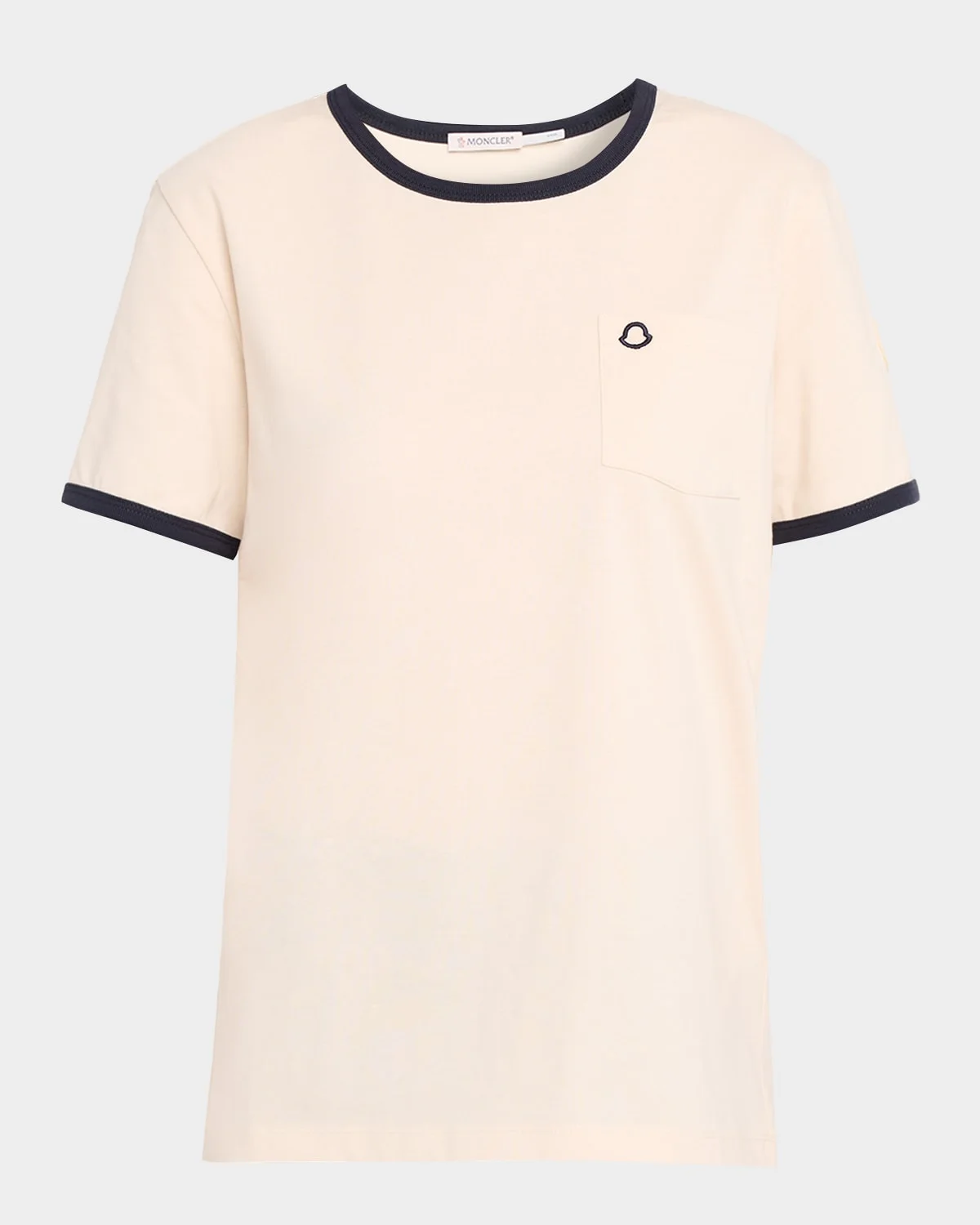 Moncler classic cottonjersey ringer tee adorned with a mini embroidered logo Crew neckline Short sleeves Classic fit Hem falls to the hip Pullover style Cotton Machine wash cold Imported