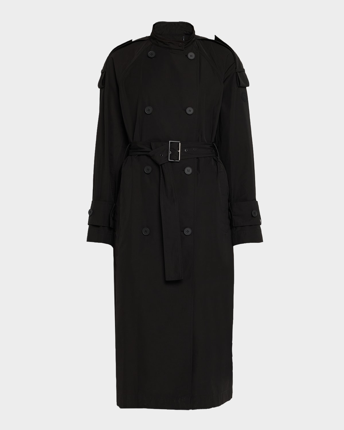 - Moncler "Trevoux" classic trench coat - Stand collar with snap closure - Epaulets - Double-breasted front - Long sleeves with belted cuffs - Adjustable self-belt - Angled side pockets - Classic fit - Walking vent - Button-front - Polyester/cotton - Unlined - Hand wash - Made in Italy