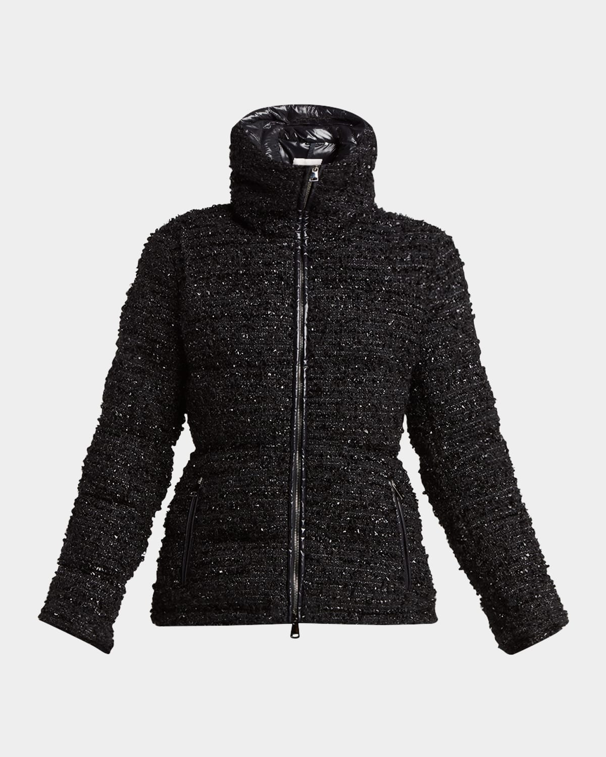 - Moncler "Urbel" jacket is a fresh take on the classic puffer in sparkly on-trend tweed - Stand collar - Long sleeves - Side zip pockets - Classic fit - Hem sits at the hip - Two-way zip-front - Mohair/cotton/wool - Lining: Nylon - Fill: Down/feather - Professional cleaning recommended - Imported