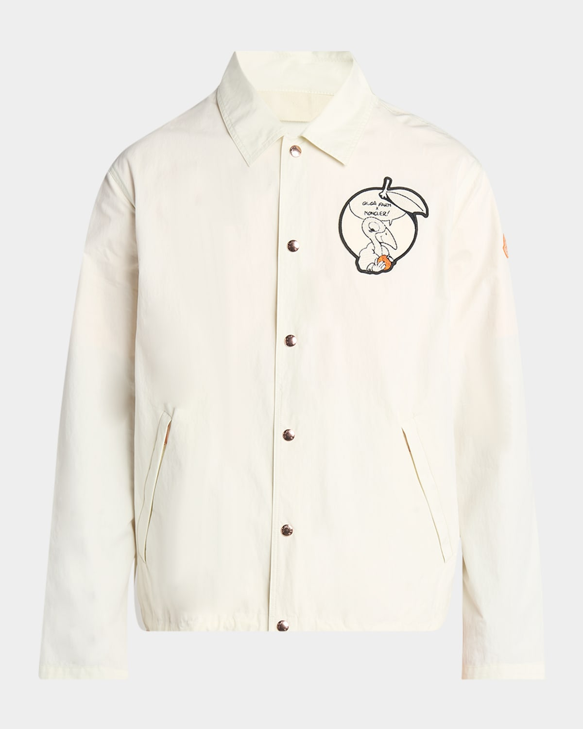 - Inspired by workwear, the Moncler x Gilga Farm by Donald Glover "Satsuma" jacket is embroidered with comic book-style patches - Approx. 27.95"L from shoulder to hem - Crafted from cotton and nylon canvas - Point collar - Long sleeves - Two side zip pockets - Drawstring hem - Loose fit - Nylon/polyamide/cotton - Lining: Nylon - Made in Romania