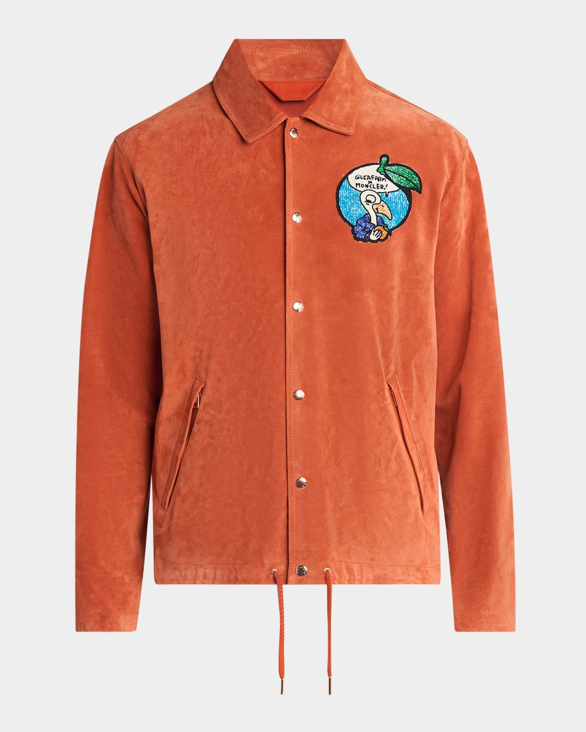 - Crafted from suede, the Moncler x Gilga Farm by Donald Glover overshirt features beaded motifs depicting mascot Monduck at the farm. - Approx. 27.95"L from shoulder to hem - Spread collar - Long sleeves - Two side zip pockets - Drawstring hem - Snap front closure - Leather - Lining: Leather - Made in Italy