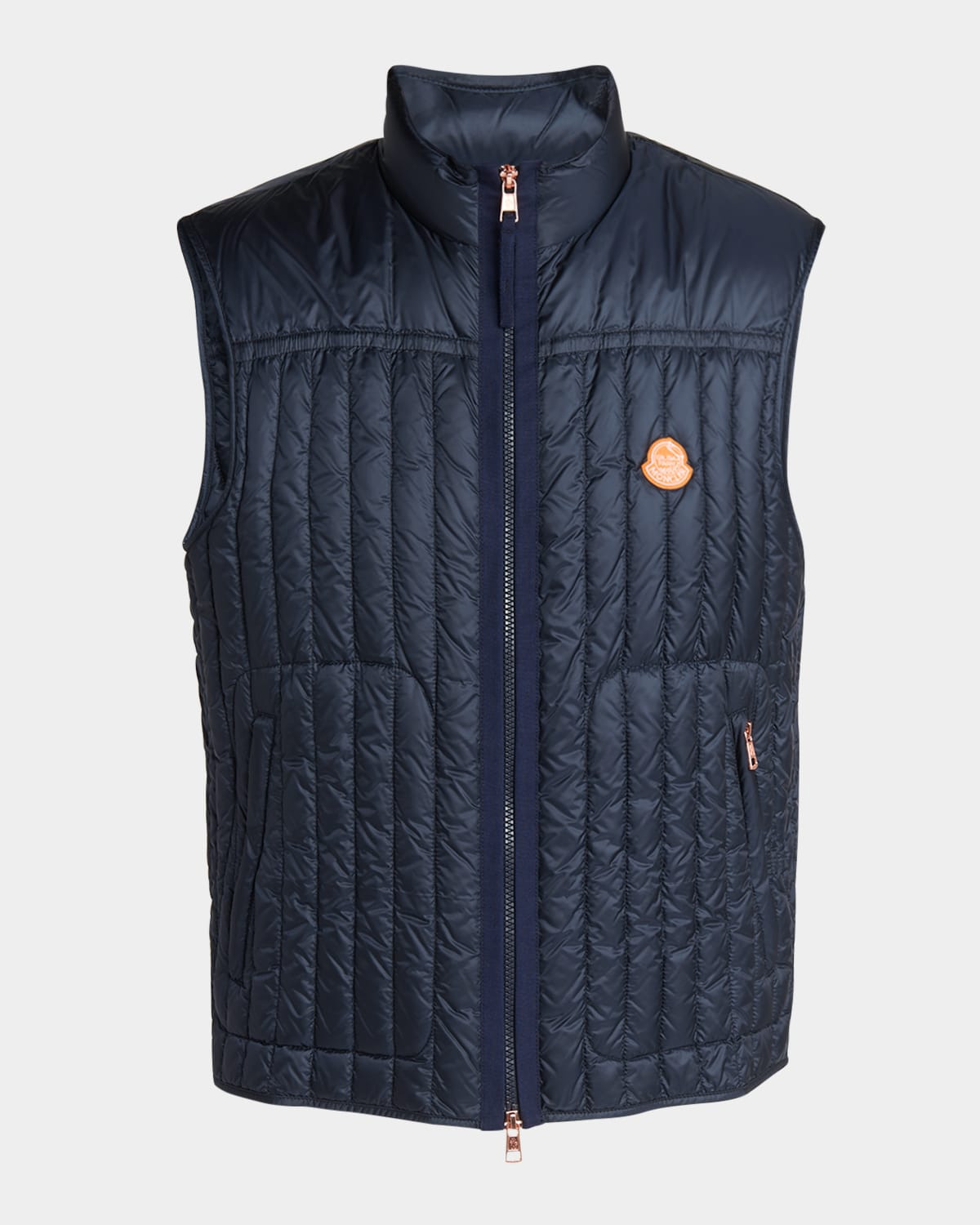 - Moncler x Gilga Farm by Donald Glover "Tangerine" water-repellent down vest defined by geometric quilting - Approx. 25.98"L from shoulder to hem - Stand collar - Sleeveless - Chest logo patch - Side zip pockets - Regular fit - Zip front closure - Nylon/polyamide - Lining: Nylon - Fill: Down/feather - Made in Romania