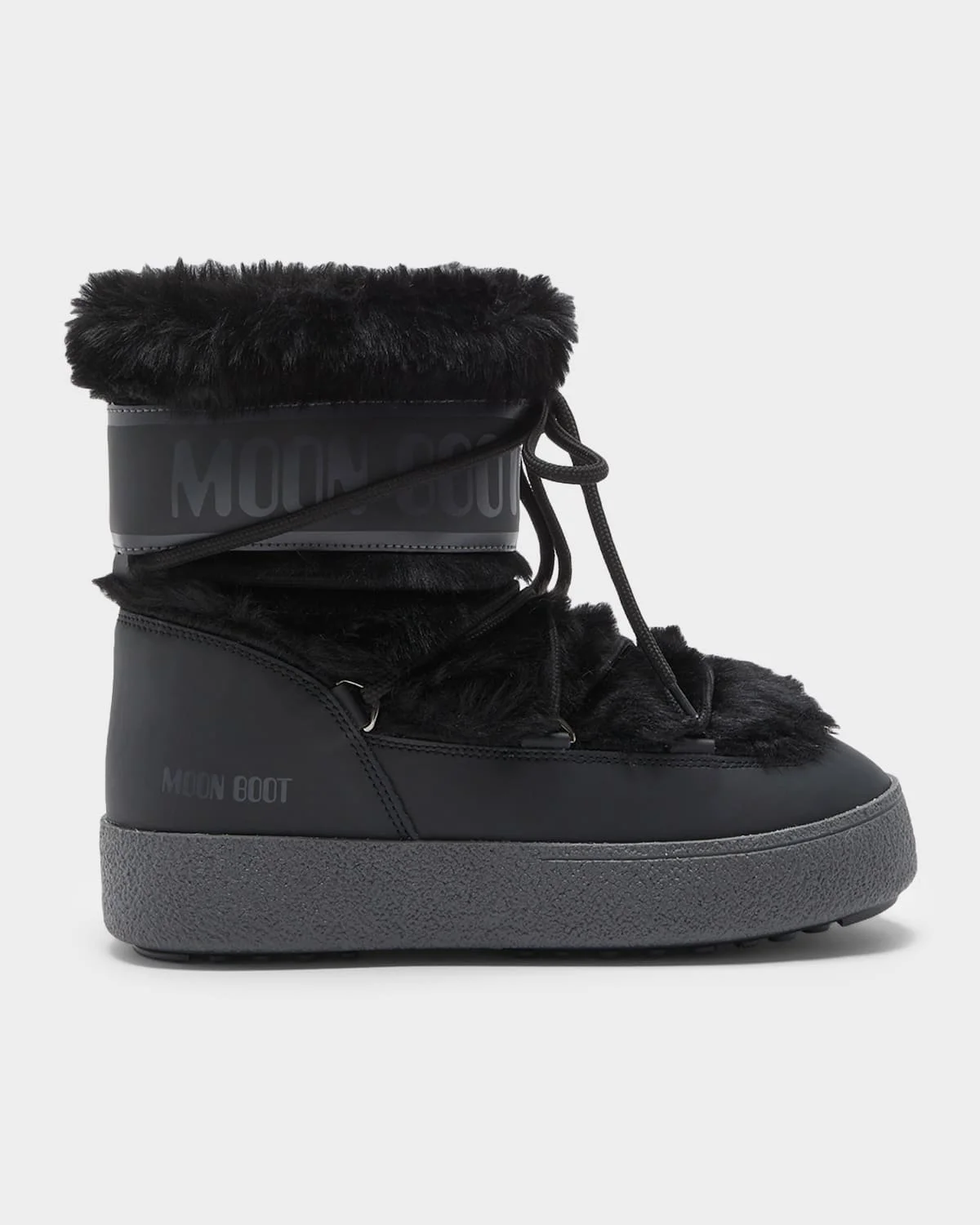 Designed in a part shoe, part sneaker silhouette, Moon Boot's "Ltrack" ankle boots are crafted from fluffy faux fur (modacrylic/polyester) in a waterrepellent membrane Flat heel Round toe Crisscross tubular laces Selftie drawstrings at the collar Logoprinted side panel PVC heel counter and trim Pullon style Multisize foam lining Thermoplastic midsole Rubber tread outsole with suction pads Made in Romania