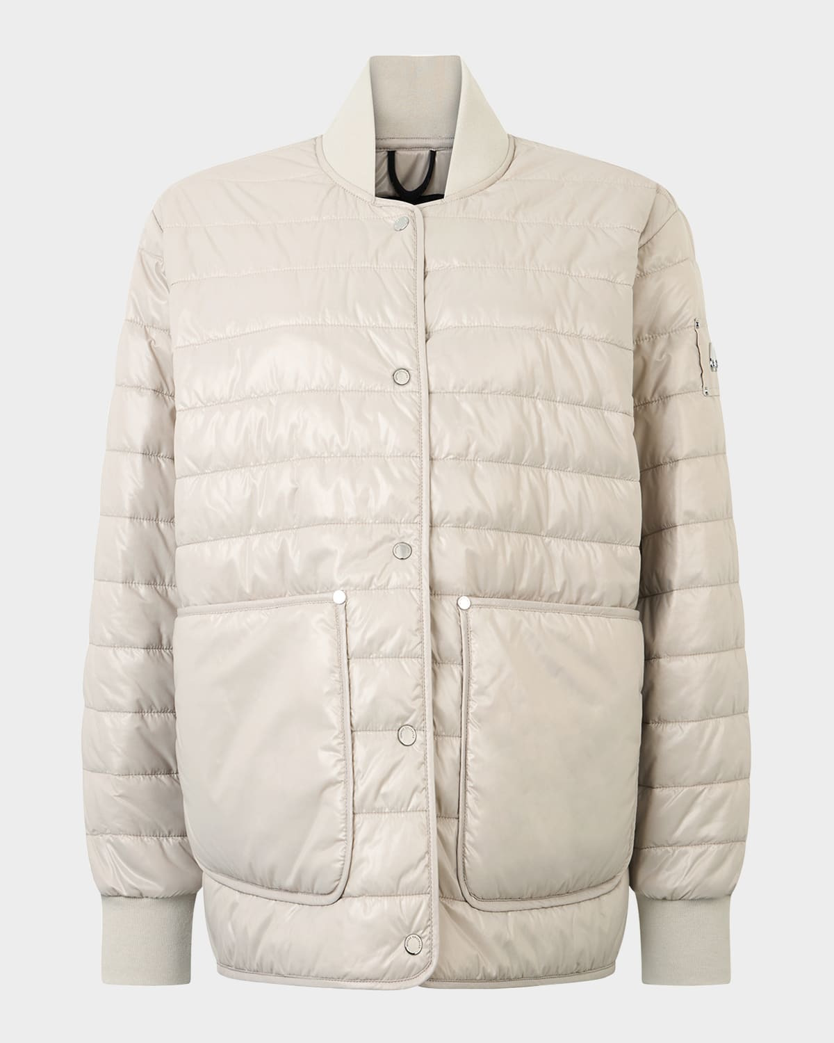 Crafted in waterrepellent and windresistant shiny nylon, the "Eden" liner jacket by Moose Knuckles features a relaxed silhouette perfect for layering. Cold weather protection down to 32°F. Ribknit baseball collar Dropped shoulders Long sleeves with ribknit cuffs Signature metal logo plaque on the left sleeve Patch pockets Relaxed fit Highlow hem Snapfront Nylon/polyamide Fill: Recycled polyester Lining: Nylon Dry clean, machine wash cold Imported