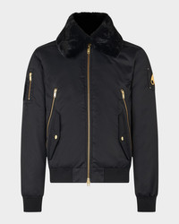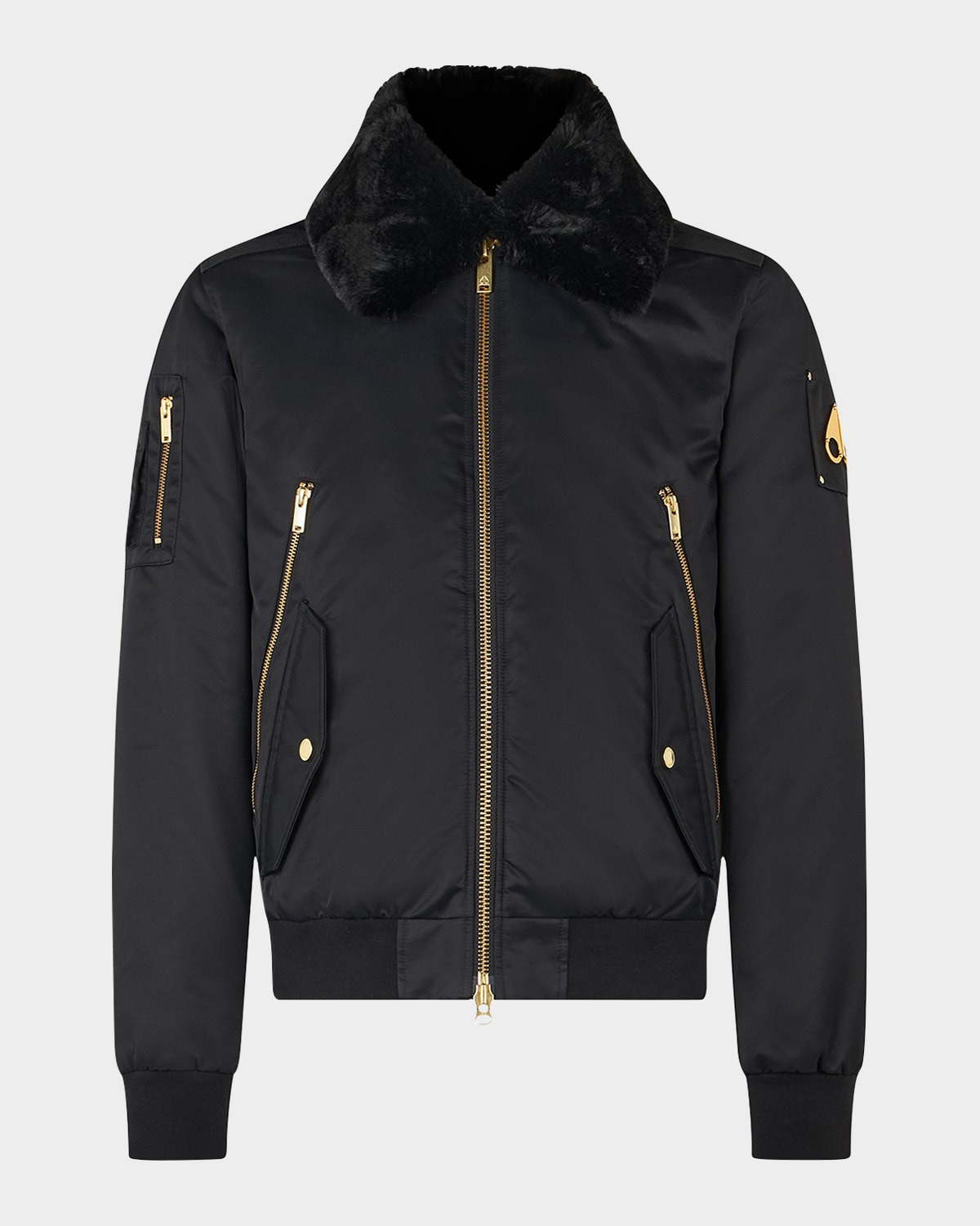 - Moose Knuckles "Courville Bunny" plush bomber jacket with gold-tone hardware - Removable faux fur (polyester) top collar - Two-way zipper with logo puller - Two angled zip pockets extending from chest to waist - Two waist pockets with flap closure - Sleeve pocket with pen pocket and zip pocket - Ribbed cuffs and waistband - Nylon/polyamide/polyester - Dry clean, machine wash cold, tumble dry - Imported - Model is 6'1"/185cm.