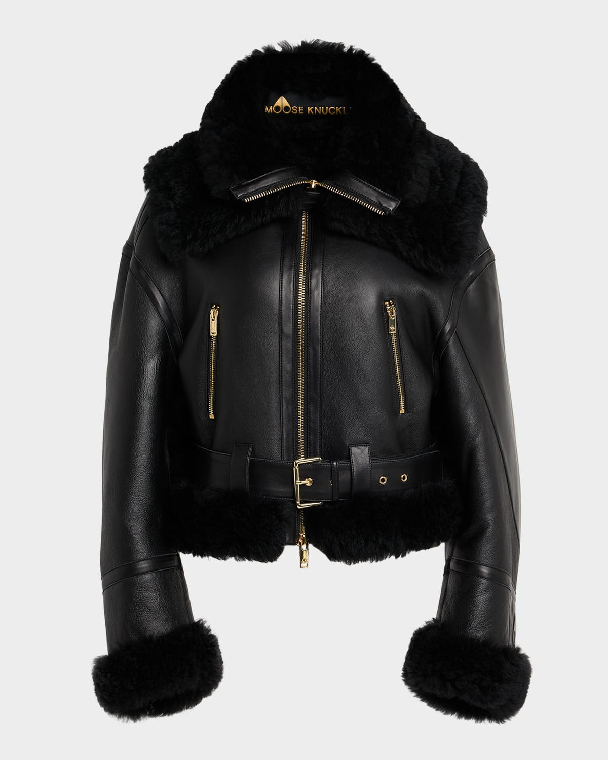 Crafted from luxurious leather, the "MTD" biker jacket from the Moose Knuckles Gold Series collection boasts genuine dyed shearling (Spain) hood and trim for a bold silhouette. Wide collar; twoway zipfront Dropped shoulders Long sleeves Vertical zip pockets Relaxed, oversized fit Adjustable belt Shearling/leather Trim: Fur Professional cleaning recommended Imported
