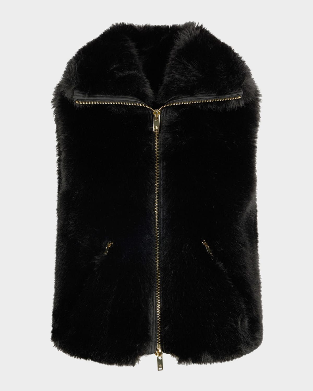 Crafted in plush faux fur, the "River" vest from the Moose Knuckles Gold Series Collection features a classic silhouette with goldtone hardware. Coldweather protection down to 32°F. Wide shawl collar; twoway zipfront Sleeveless Side zip pockets Slim fit Hem sits at the hip Polyester Lining: Polyester/elastane Machine wash cold, line dry Imported