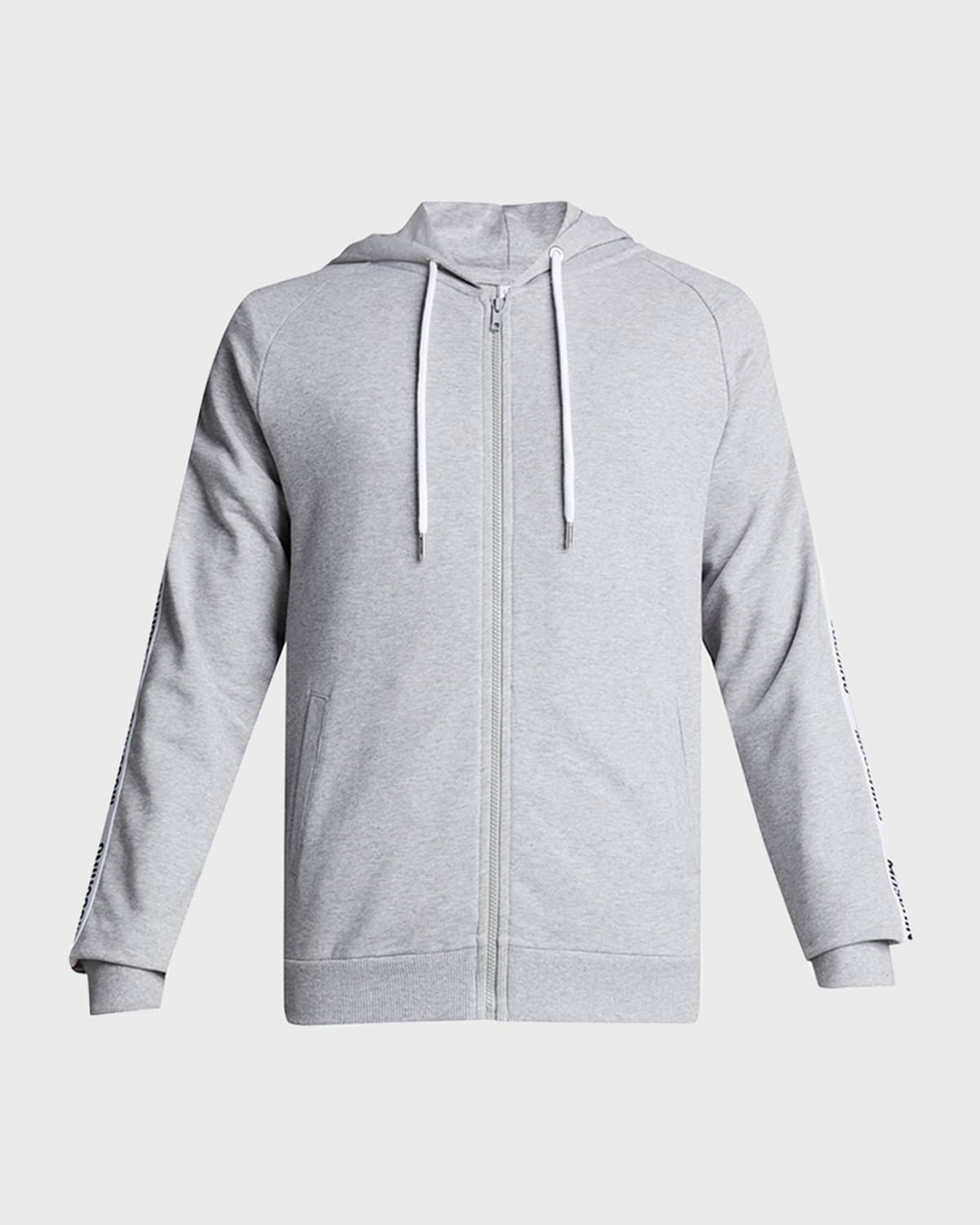 - Moschino hoodie with logo taping down arms. - Drawstring hood; zip front. - Side slash pockets. - Ribbed cuffs and hem. - Cotton/spandex. - Made in Greece.