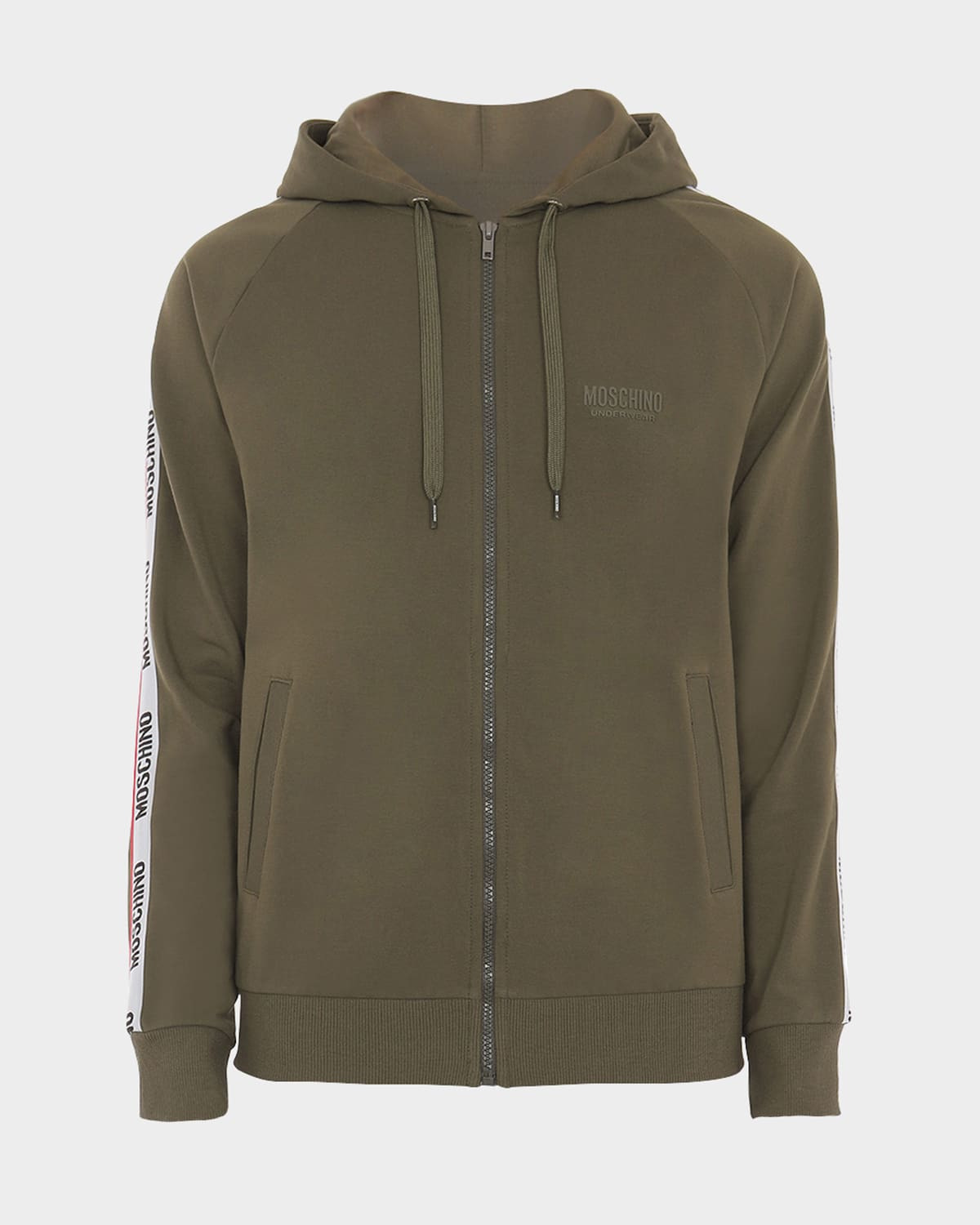 - Moschino hoodie with logo taping down sleeves - Drawstring hood; zip front closure - Tonal logo at chest - Long raglan sleeves - Ribbed cuffs and hem - Cotton/elastane - Made in Italy - Model is 6'1"/185cm.