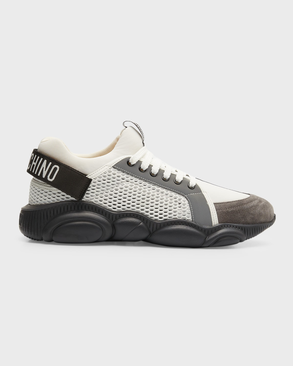- Moschino low-top sneakers with mixed media mesh upper - Flat heel - Reinforced round toe - Lace-up vamp; logo taping - Logo pull tab at tongue - Webbed logo grip strap at backstay - Embossed heel logo - Signature Teddy Bear-shaped rubber outsole - Made in Italy