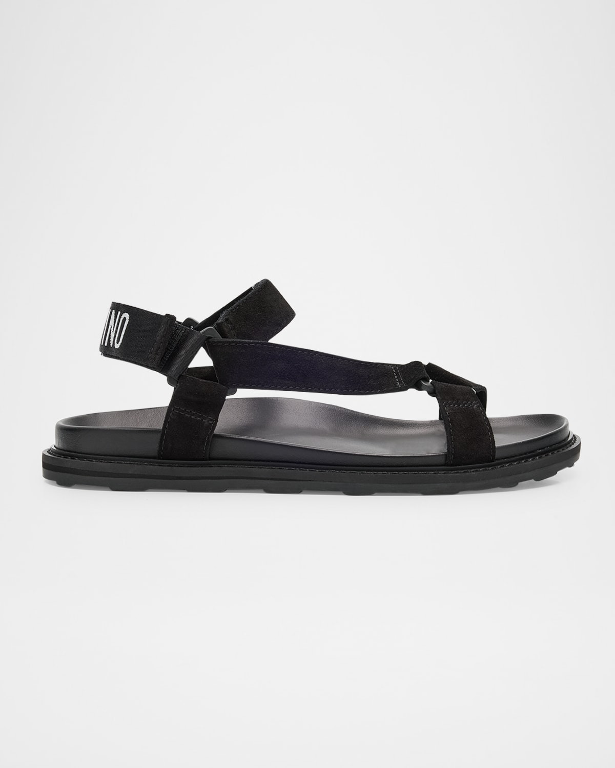 - Moschino sandals showcasing a strappy leather upper - Flat heel - Open toe - Goat leather/PU lining - Molded footbed - Adjustable ankle grip strap with webbing logo - Spot clean - Made in Spain