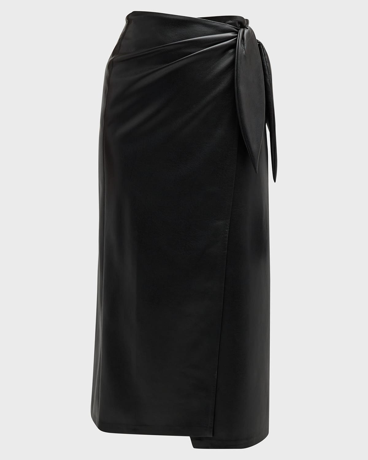 Nanushka "Amas" midi skirt featuring a side tie detail in faux leather Elastic waist Midrise Wrap silhouette Hem falls below the knee Hidden side button closure Faux leather Polyester lining Dry clean Imported