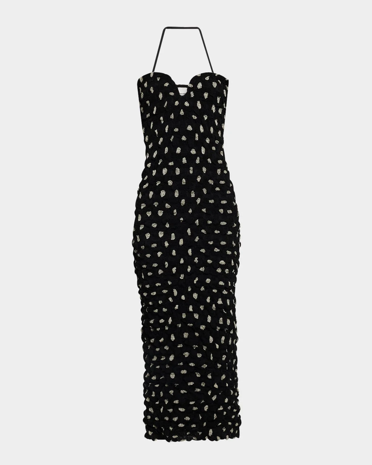 - Nanushka "Haylen" polka dot midi dress in a textured seersucker chiffon - Halter sweetheart neckline - Sleeveless - Figure-hugging silhouette - Hem falls below the knee - Slipover style - Rayon/cellulose acetate/polyester/viscose - Lining: Polyester - Machine wash warm - Imported