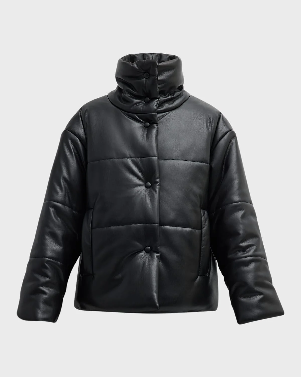 Nanushka "Hide" puffer jacket featuring a highneck collar in a quilted faux leather Dropped shoulders Long sleeves Angeled welt pockets Oversized fit Snap front closure Faux leather Polyester lining Dry clean Imported