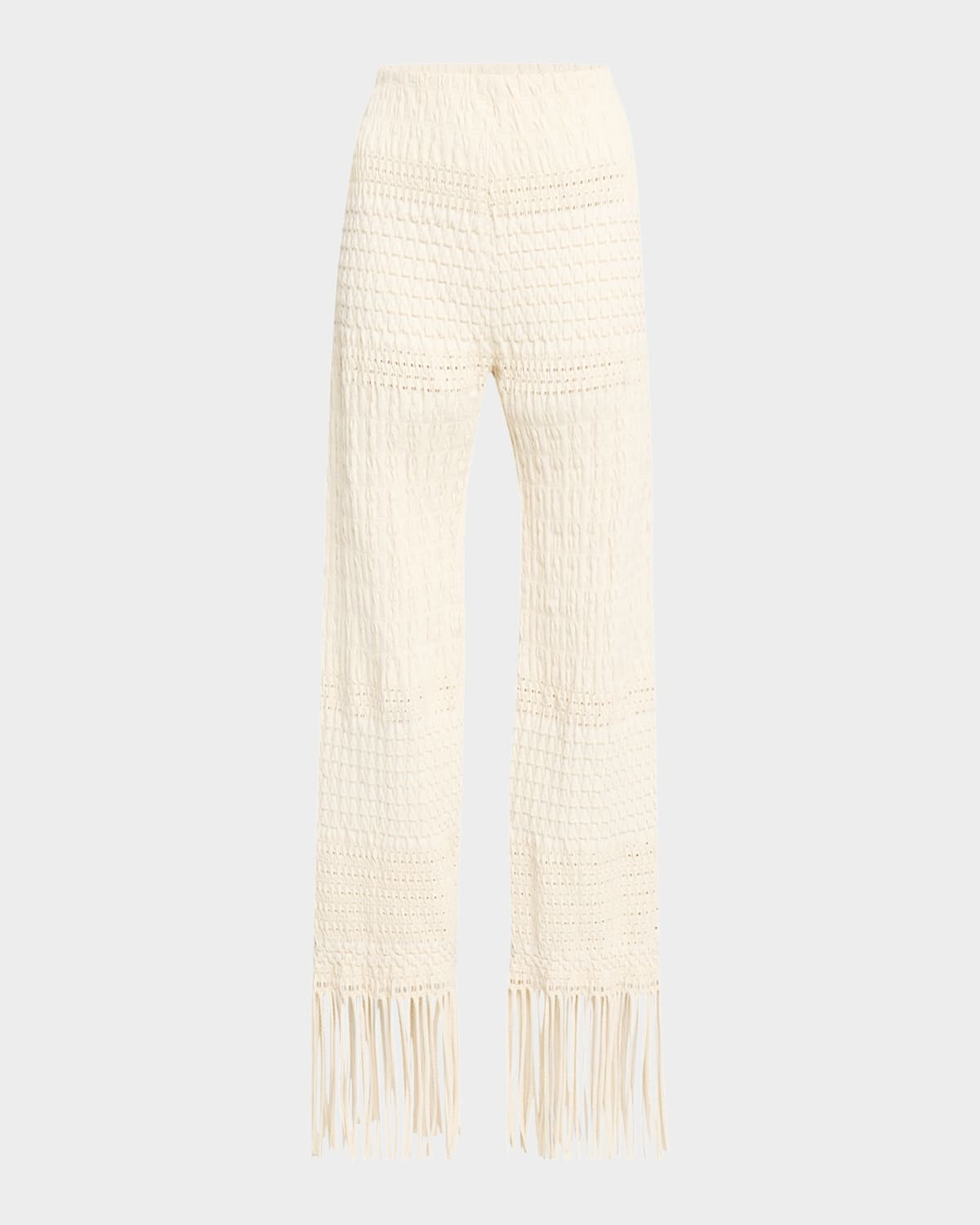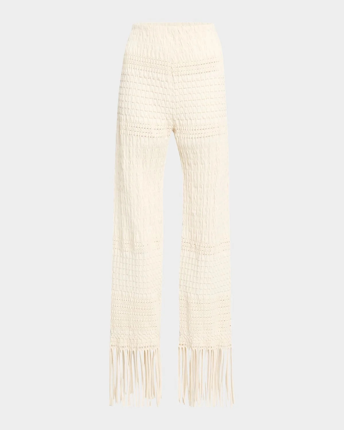 - Nanushka "Miciel" seersucker pants finished with fringe - High rise - Elastic waistband - Straight legs - Full length - Pull-on style - Polyester - Dry clean - Imported