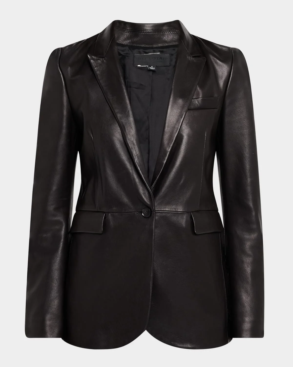 - Nili Lotan "Belmonde" tailored jacket in lambskin leather - Peak lapels; single-breasted front - Long sleeves; button cuffs - Chest welt pocket - Hip flap pockets - Slim fit - Hem falls below the hip - Walking vent back - Leather - Made in USA from imported materials