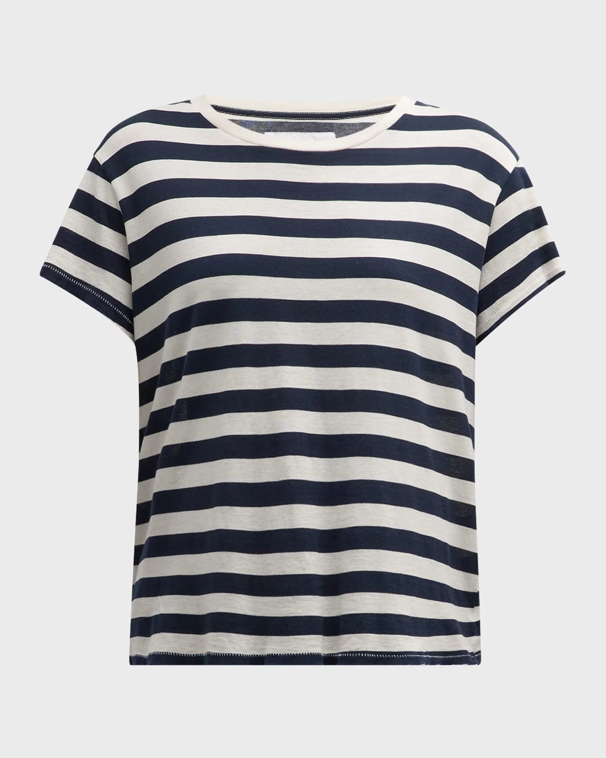 Nili Lotan "Brady" Tshirt featuring a striped motif Crew neckline Short sleeves Loose fit Pullover style Cotton Made in USA