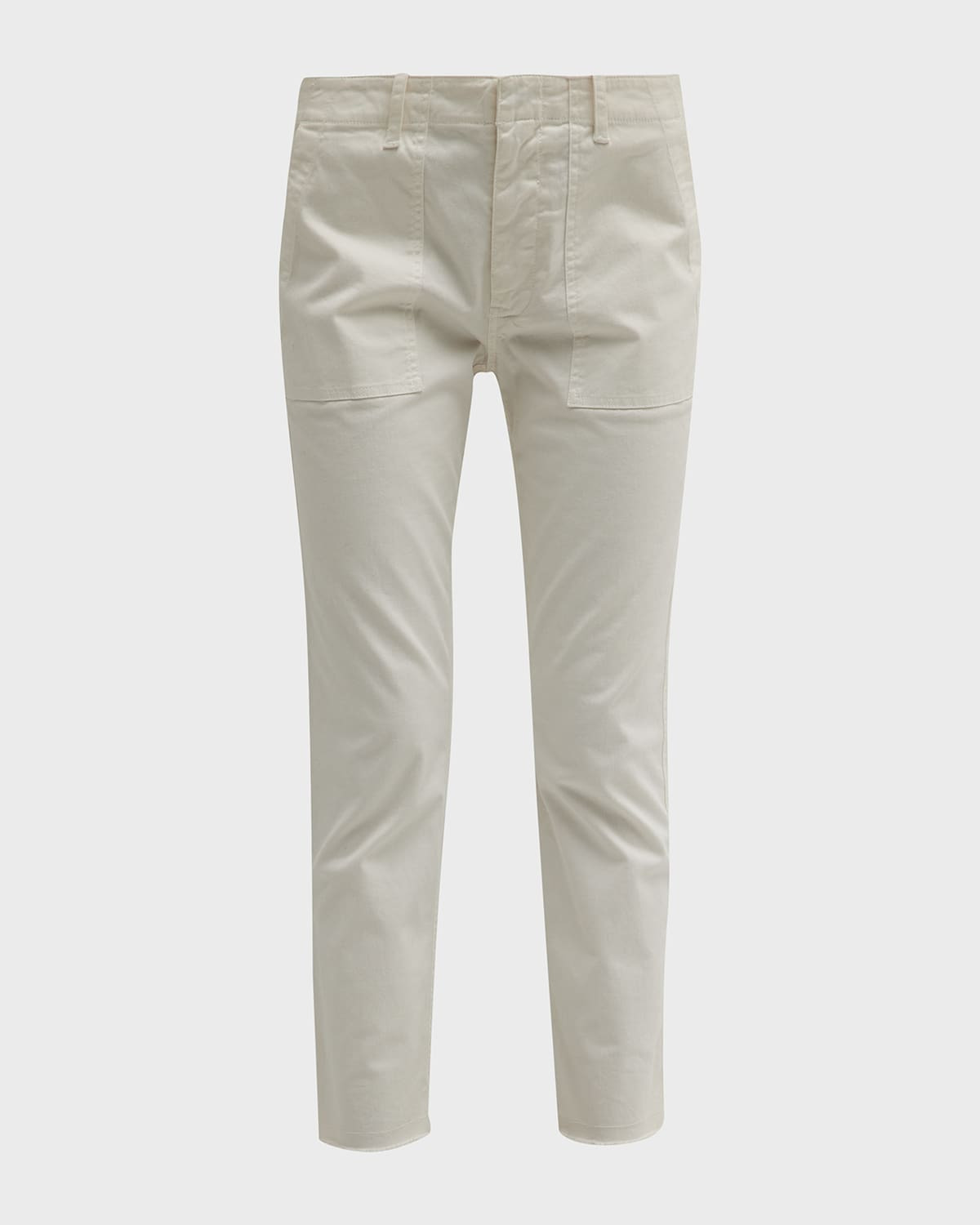 - Nili Lotan "Jenna" pants in stretch cotton twill. - High rise - Front patch pockets. - Back flap pockets. - Straight legs. - Cropped above ankles. - Raw-edge hem. - Hook/zip fly. - Cotton/spandex. - Made in USA of imported material. - Size Note: Item runs large, consider ordering a size down.