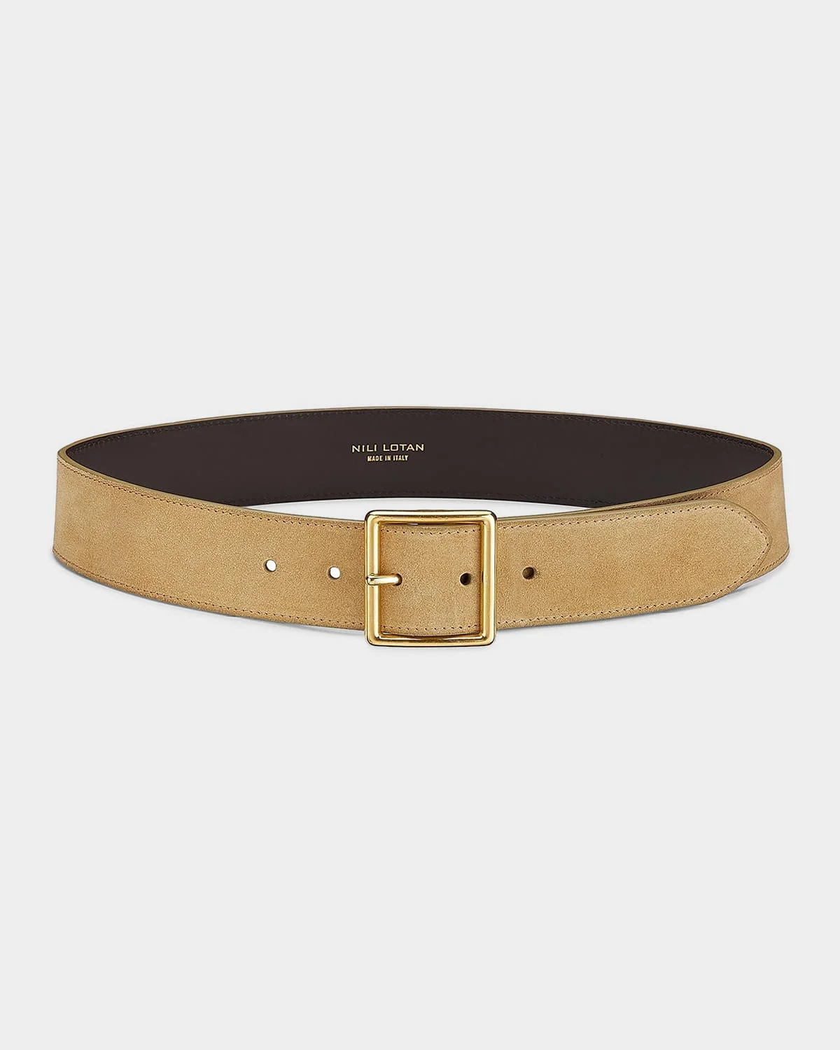Nili Lotan "Marcela" belt in calf suede Goldtone hardware Adjustable fit Tapered end Leather Made in USA from imported materials