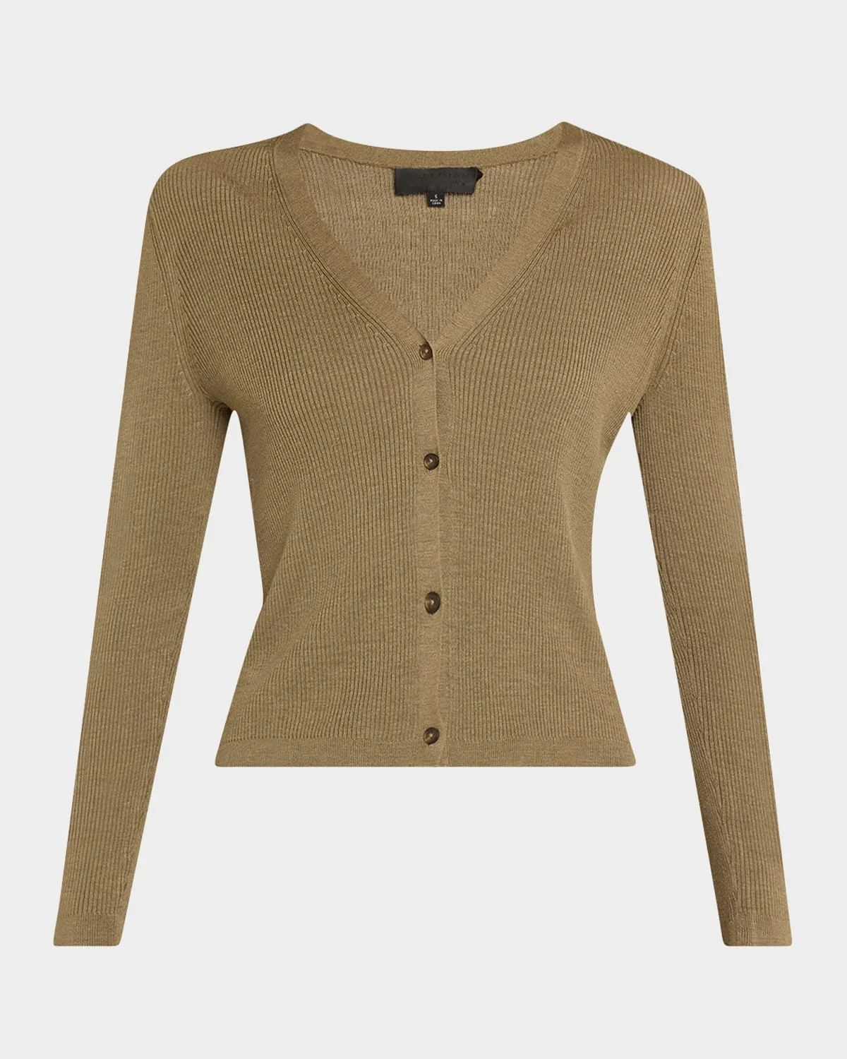 - Nili Lotan "Nari" ribbed cardigan - V neckline; button front - Long sleeves - Slim fit - Silk - Made in USA from imported materials
