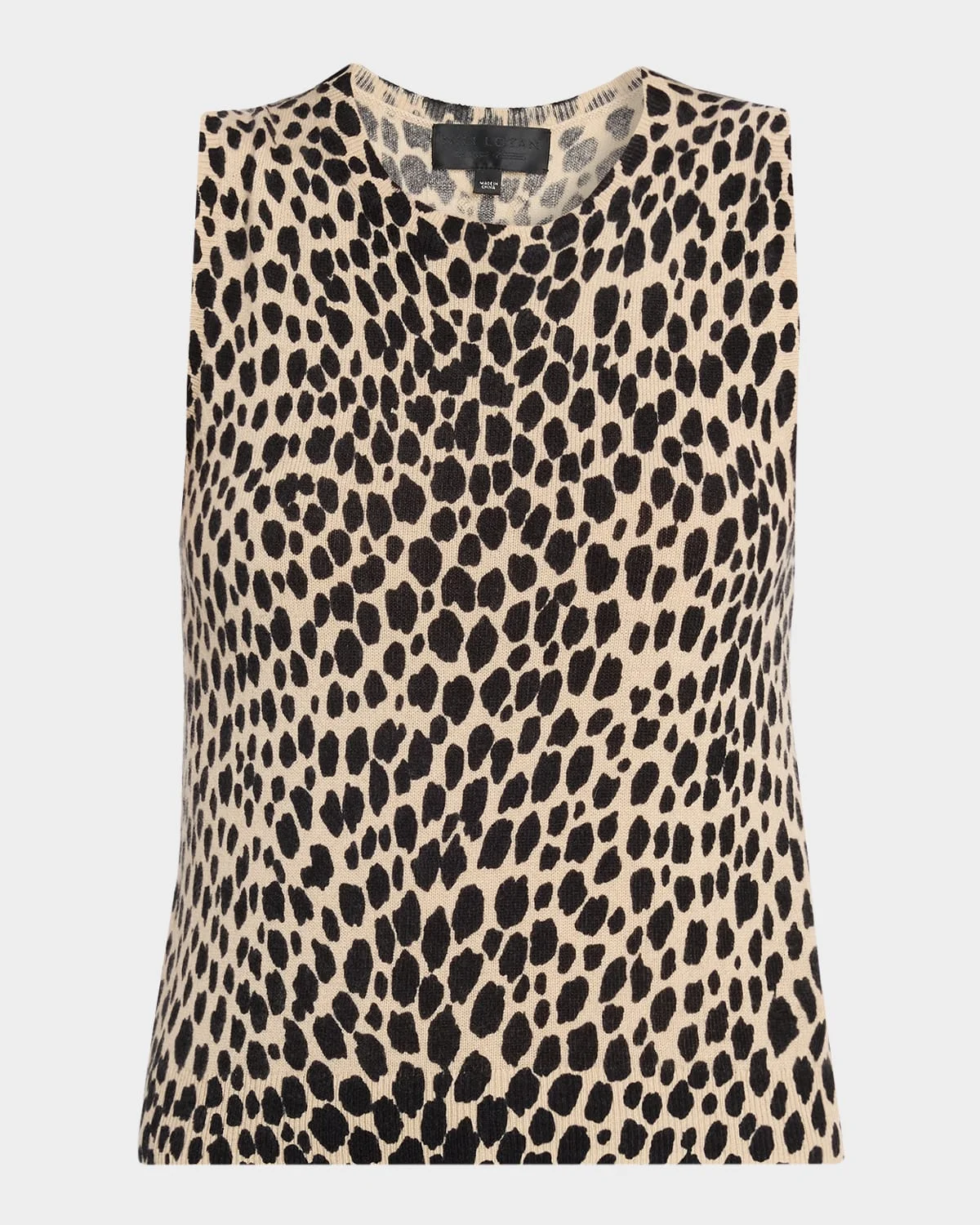 Nili Lotan "Nessa" short sweater tank top patterned with a striking cheetah print. Crew neckline Sleeveless Signature center back cable knit detail Slim fit Pullover style Cashmere Dry clean Made in USA