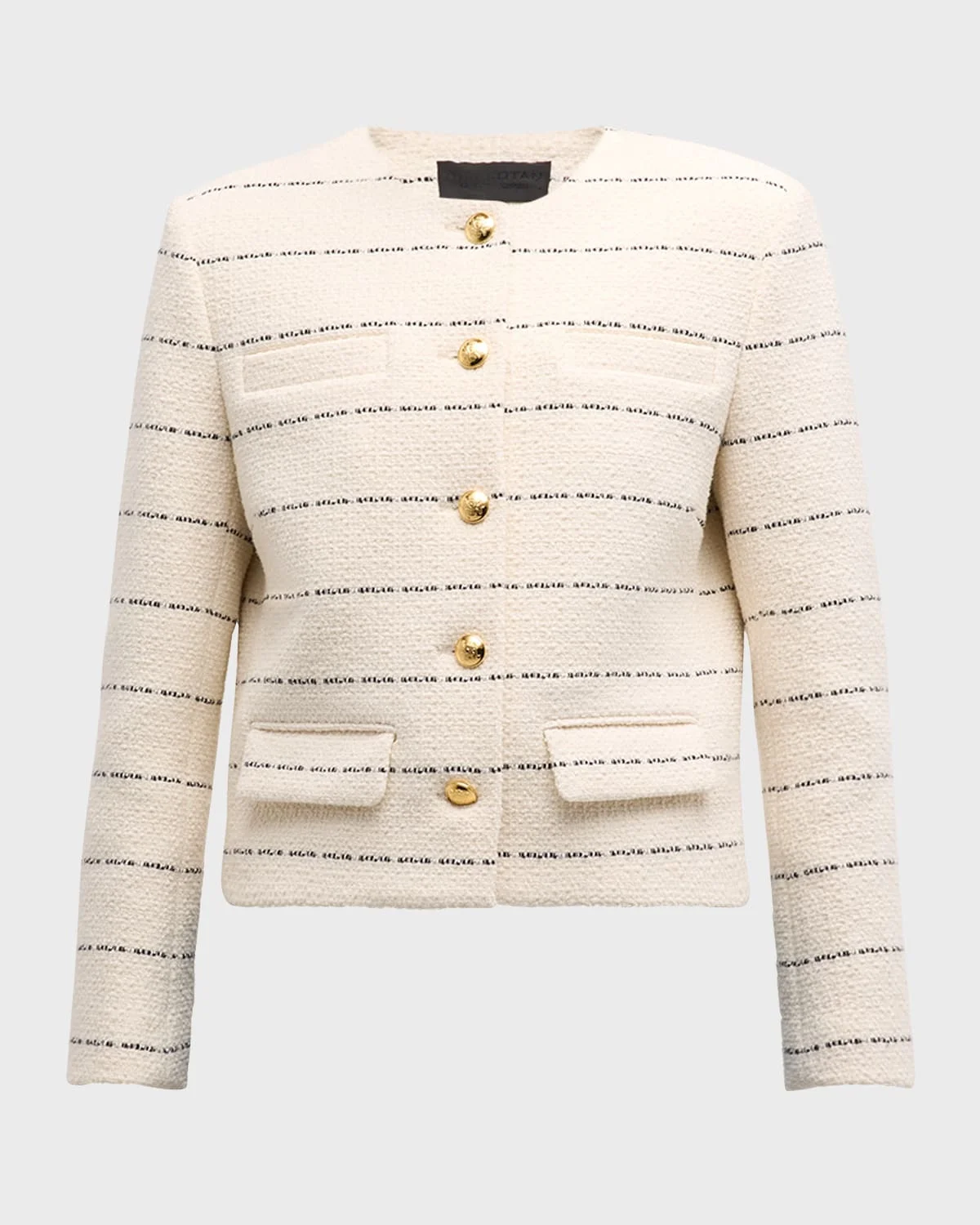 Nili Lotan "Paige" boucle cardigan with horizontal stripes Jewel neckline; button front Long sleeves; button cuffs Four pocket front Boxy fit Cotton/nylon/polyamide/polyester Made in Portugal Model is 5 & apos;10"/177cm.