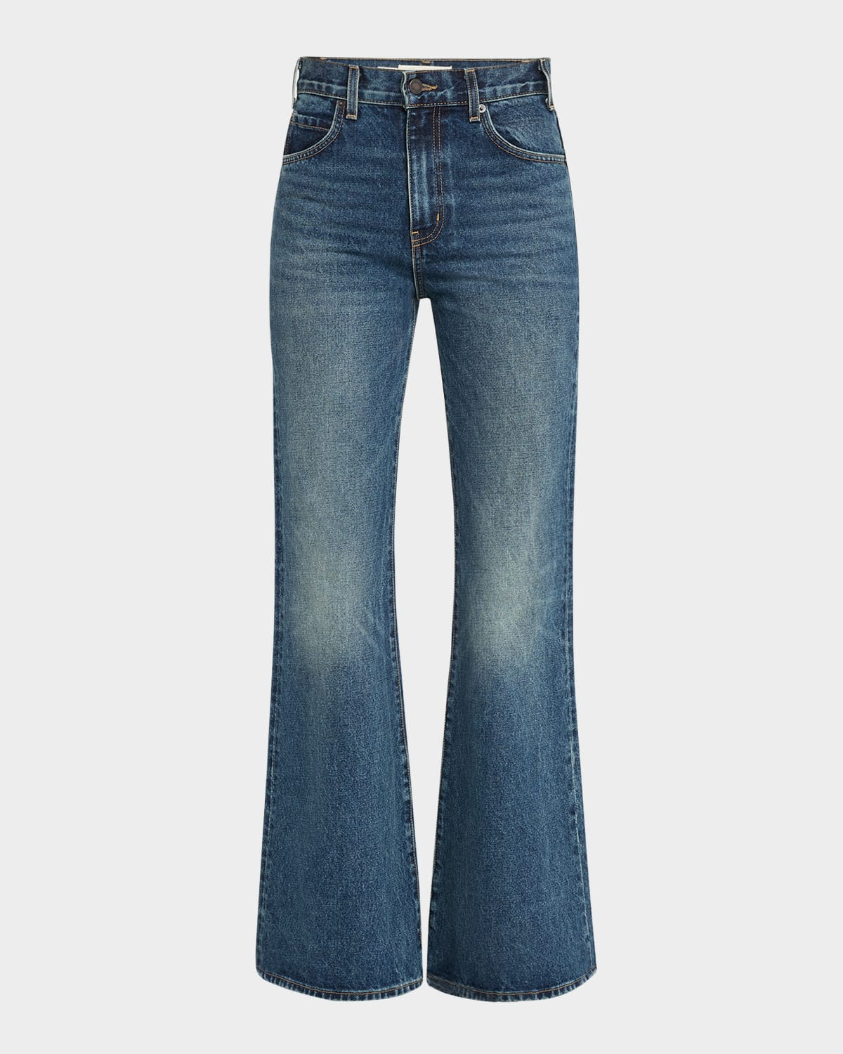 - Nili Lotan "Roe" jeans in faded and slight whiskered medium-wash denim - Mid rise sits high on hip - Five-pocket style - Flared legs - Full length - Button/zip fly; belt loops - Cotton - Made in USA
