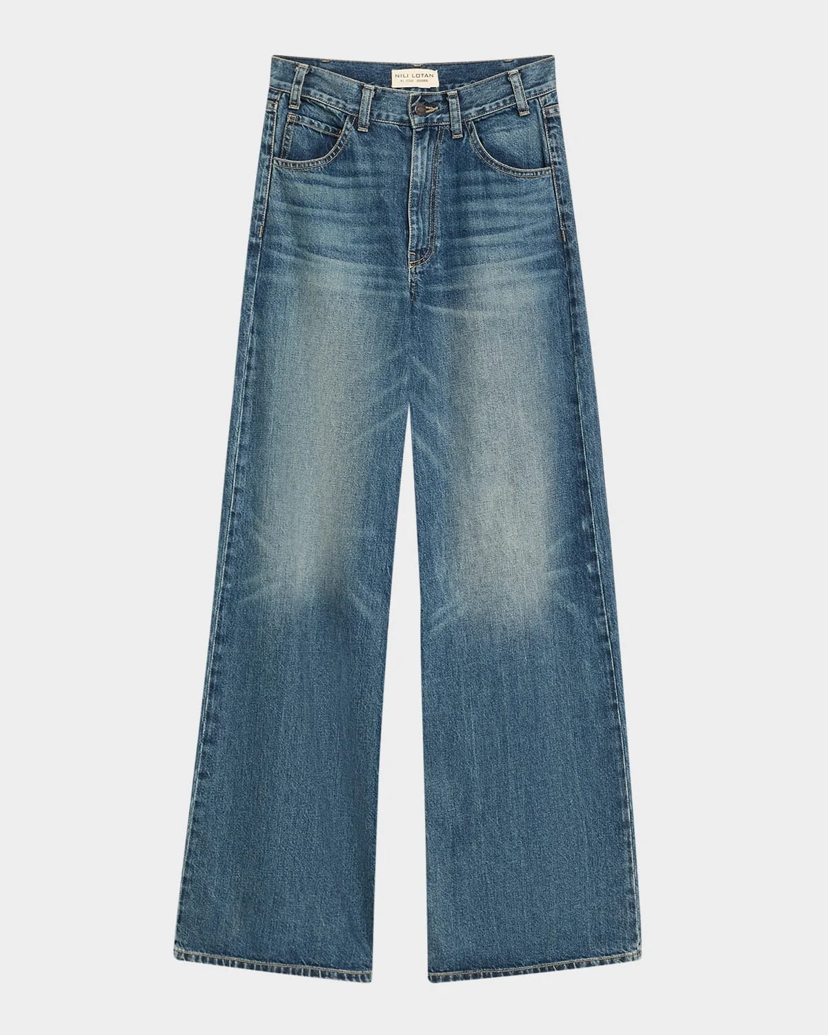 - Nili Lotan "Salome" jeans in a faded Simon wash - Hgh rise - Five-pocket style - Wide legs - Full length - Button/zip fly; belt loops - Cotton - Machine wash cold, machine wash tumble dry - Made in USA