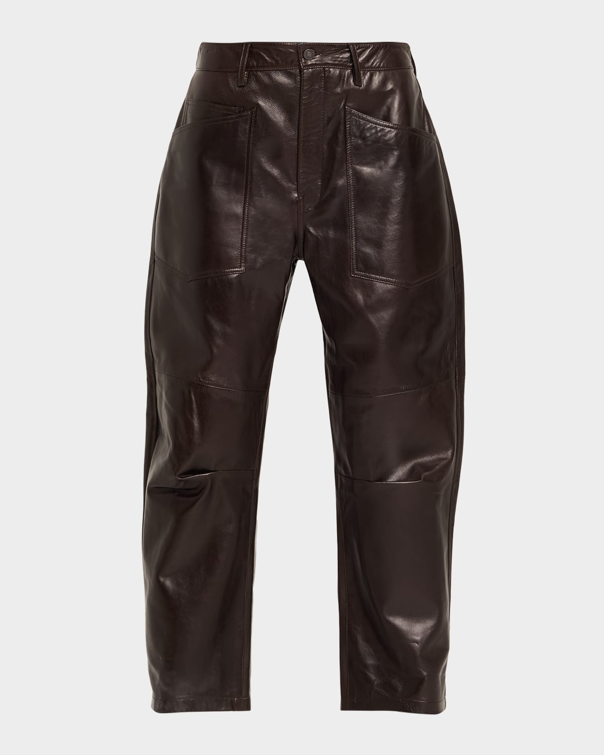 - Nili Lotan "Shon" barrel pants in shiny lambskin leather with knee pleats creating a curved leg - Mid rise sits high on hip - Front and back patch pockets - Curved legs - Cropped at the ankle - Button/zip fly; belt loops - Leather - Imported