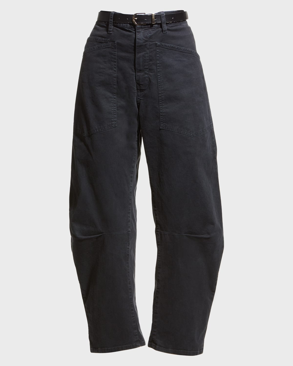 - Nili Lotan "Shon" stretch twill pants. - Mid rise. - Front patch pockets; dropped back pockets. - Curved silhouette. - Cropped length. - Hook-and-bar/zip fly; belt loops. - Cotton/spandex. - Made in USA.
